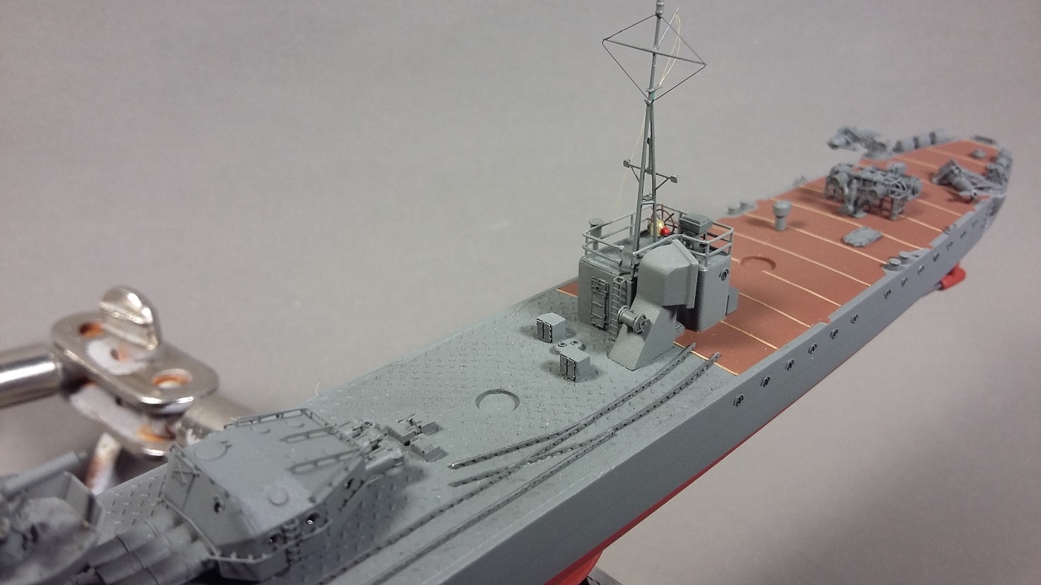 Немного продвинулся. Установил торпедный аппарат, 40 мм зенитный автомат, грот мачту, трубу камбуза, оборудовал запасной рулевой пост на кормовой надстройке.