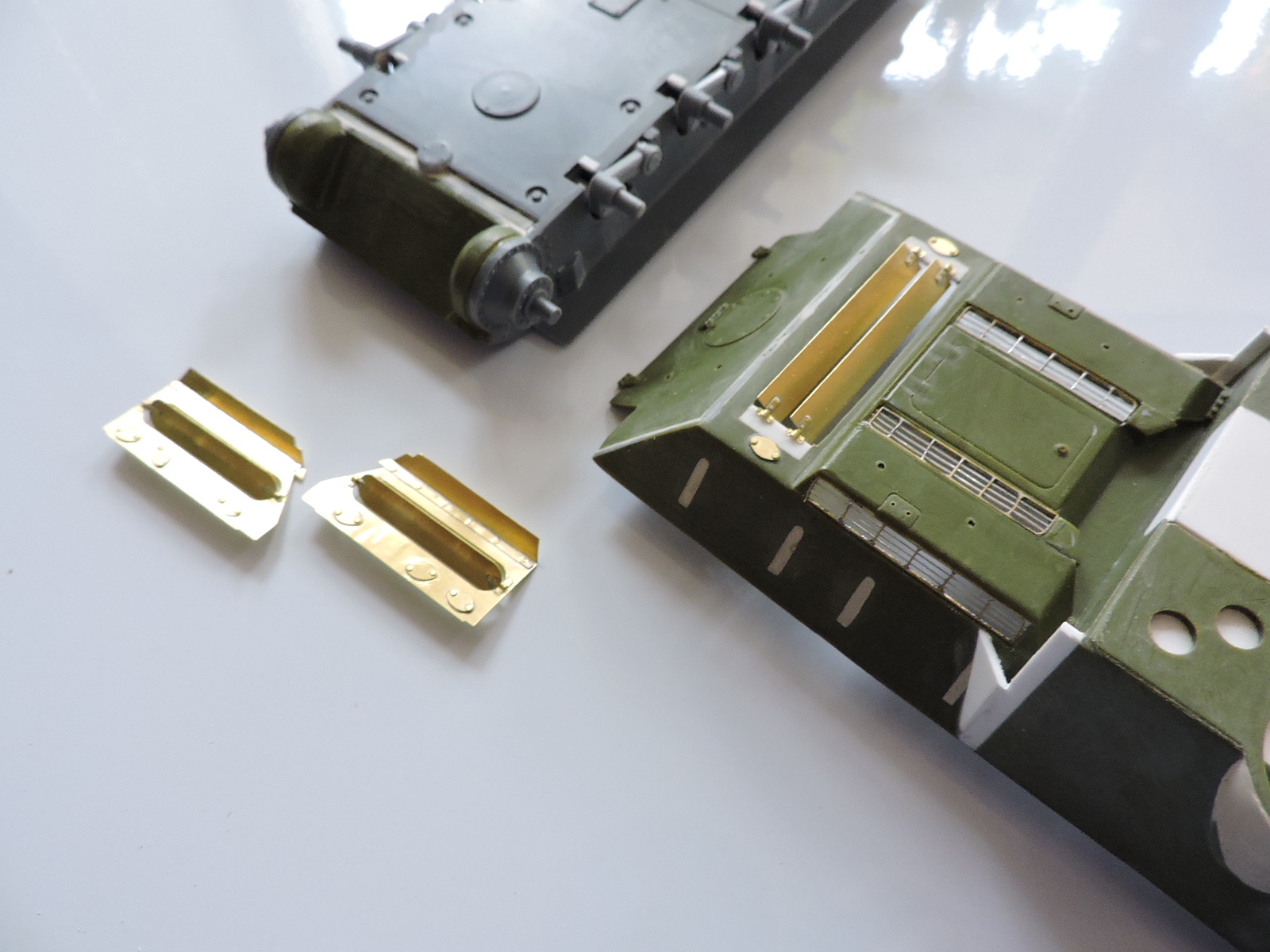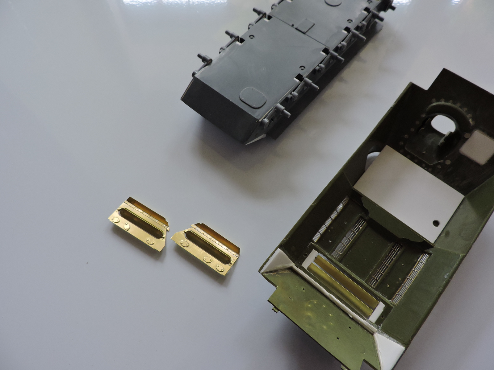 23) Вклеил фтд заслонки от Абер, спаянные ранее, щели заклеил дошипластиком (Набор фтд деталей от Абер для СУ-100/85М, магазин Западный Фронт