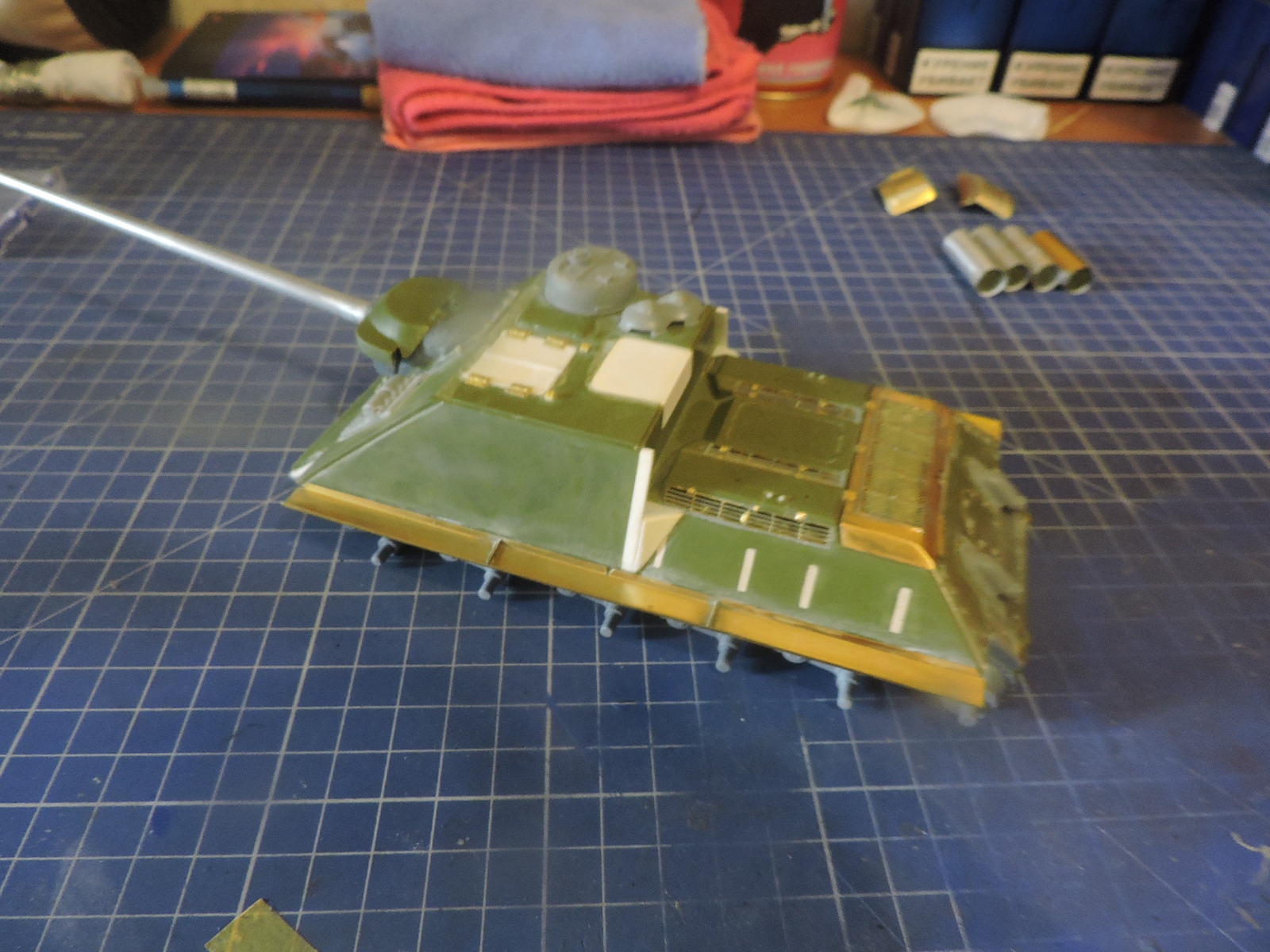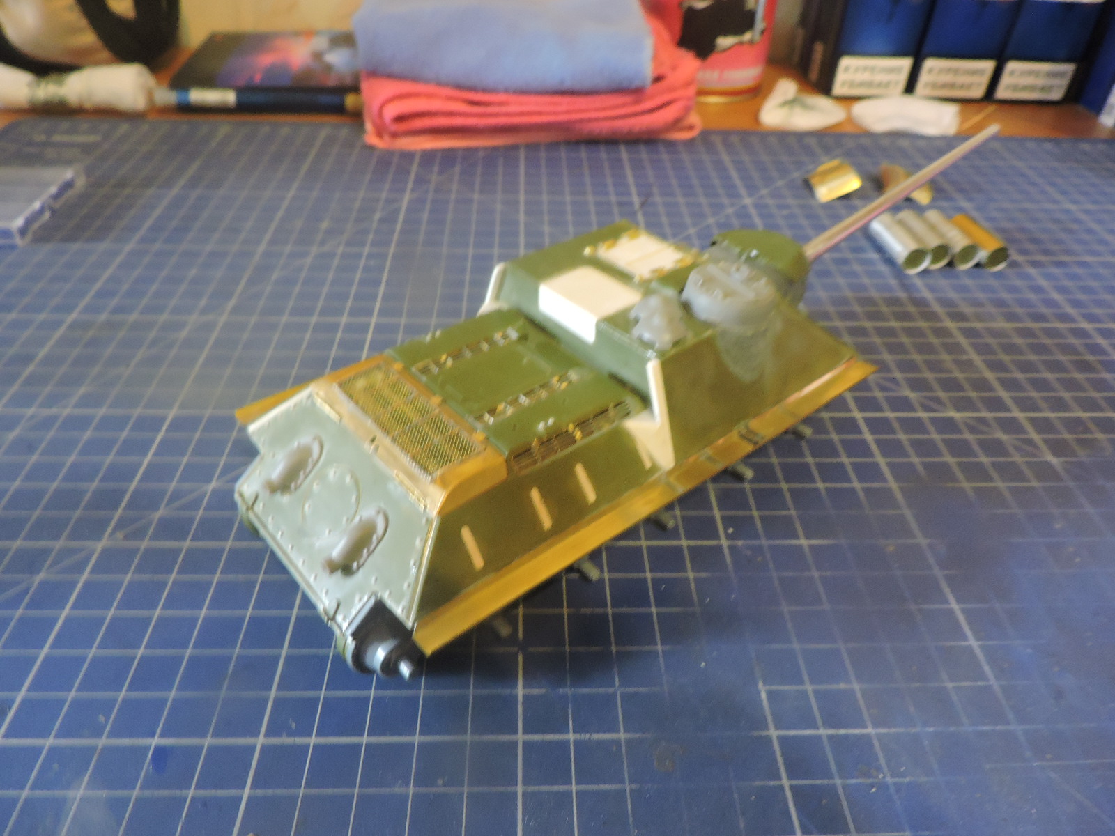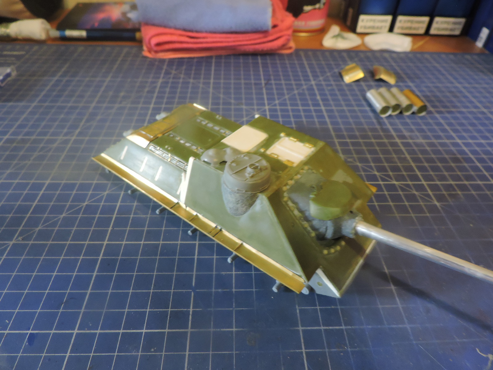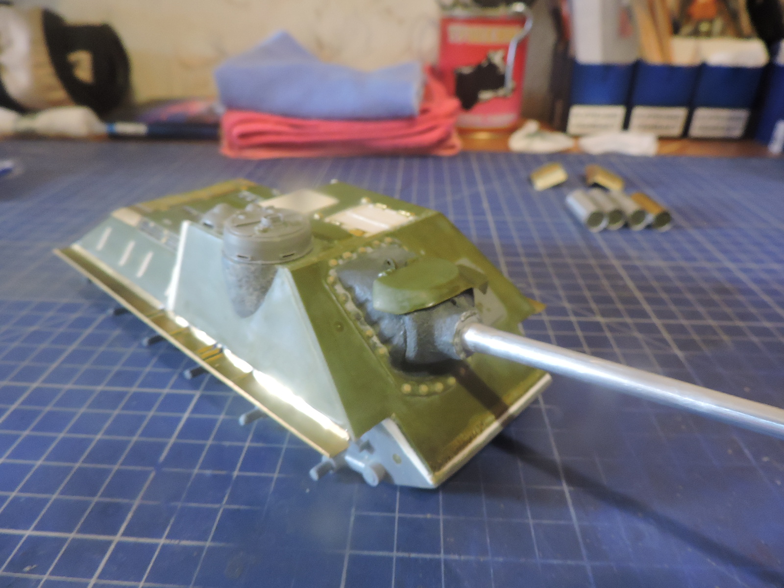 Приветствую всех, итак продолжим. Приклеил надгусеничные полки Абер, затем с помощью жидкой-твердой шпатлевки Пластмастер и кисти сымитировал на маске орудия и на основании комбашенки фактуру металла. Заменил неправильно расположенные болты на крышке над решеткой у заслонок выходящих к двигателю. Собрал ленты половинчатых траков Мастерклаб для СУ-100, вместо штырей из смолы в соединении траков в ленту использовал медную проволоку 0.3 мм.иФото позже.
