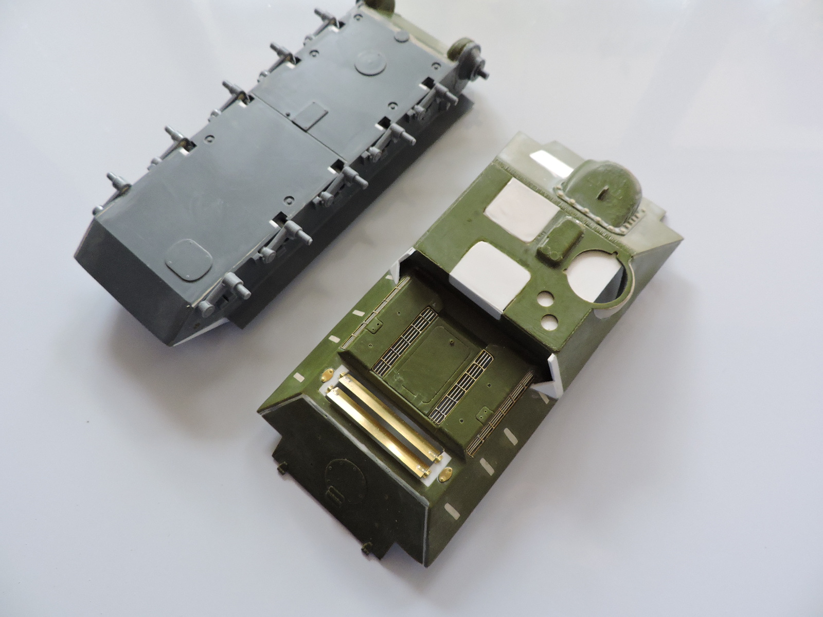 Вопрос моделистам - я в недоумении как сделать лучше, чтобы не ошибиться, так как место крепления ленивца на ванне Макета сточено, и подлежало замене на нарезанные диски из полистирола, то если была бы это просто 34ка (не важно 76 или 85мм)я бы просто перенес эти диски поближе к месту стыка ВЛД и НЛД. Но это СУ-100 я ведь нарастил стенки между боковинками ванны и ВЛД - куда клеить эти диски с последующей приклейкой на них ленивцев от Макет? Клеить их там где раньше была ближайшая точка угла стыка ВЛД и НЛД Макета, или на новую общую деталь, или попросту дождаться когда я спаяю и приклею фтд крылья а ужу потом просто "на глаз" подогнать под них ленивец? Я просто не помню как я сделал это в прошлый раз.