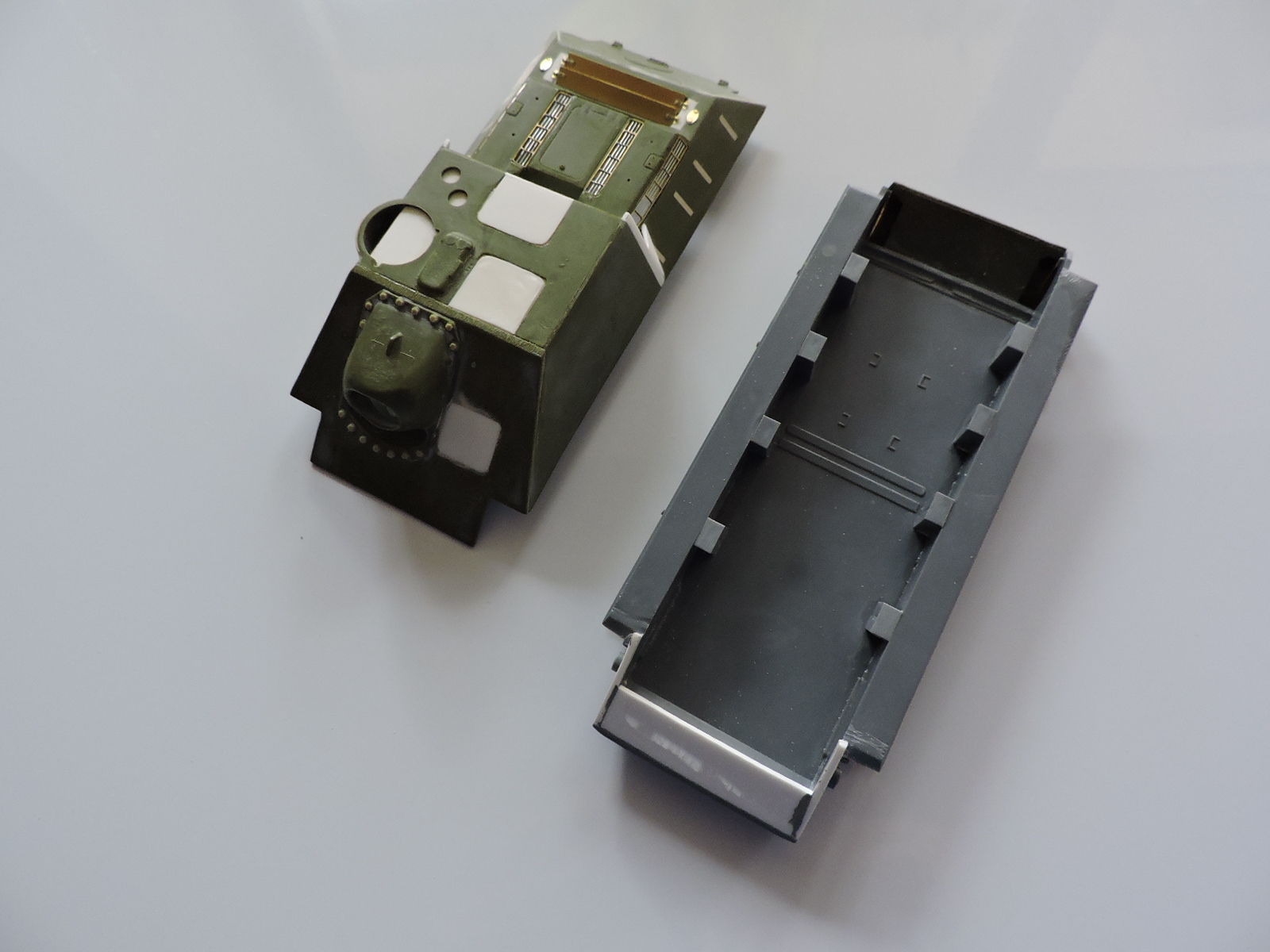 , но допустил ошибку забыл что смотровые щели на комбашне распределены неравномерно, значит приклеил не правильно, и не правильно приклеил створки с перископом на одной из низ, пришлось выламывать суперклей, отломились петли и часть обода на створке дверцы, пришлось лепить сломанное из двухкомпонентной шпатлевки от Ганзы. Вроде исправил, и установил комбашенку заново, правильно;