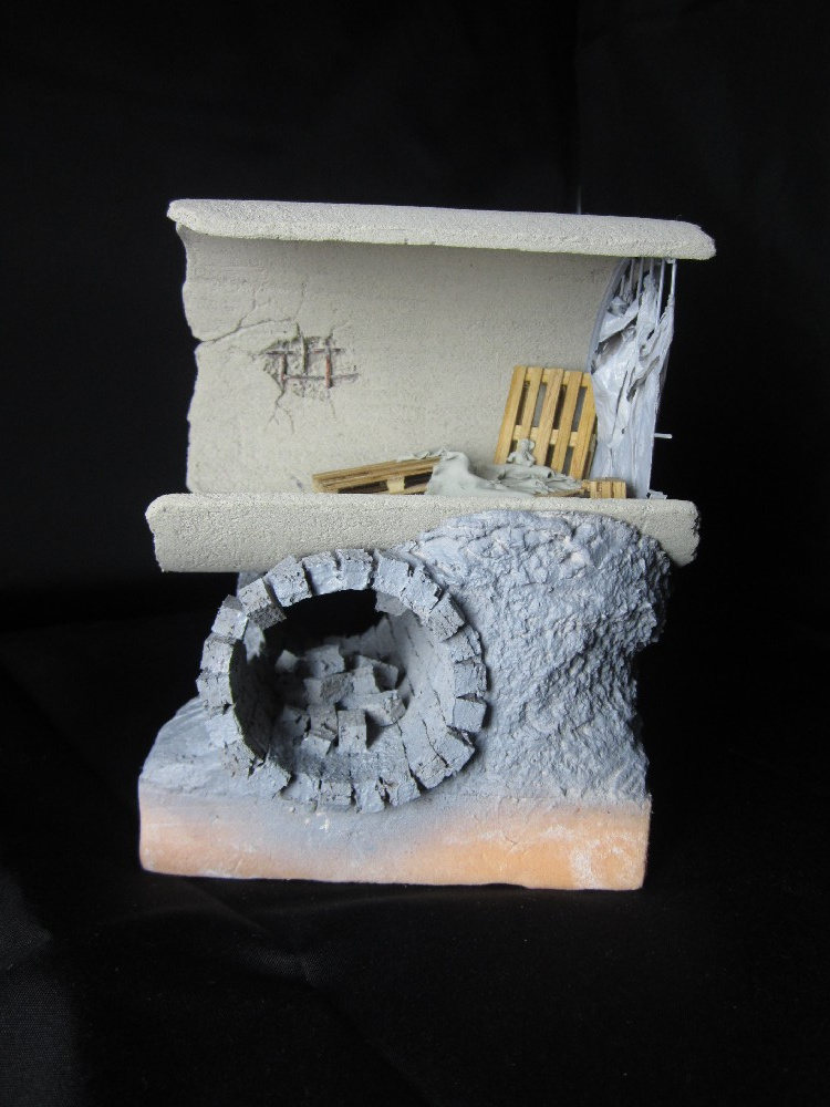 . Лучше правда сделать из Пеноплекса, просто расчертить и кирпичики поприжимать каким нибудь шаблончиком. А швы заделываются акриловой шпаклевкой, наносится просто сверху и влажной тряпочкой стираются с кирпичей, можно ее сразу подкрасить. Ну и как пример просто пробник стены в 87 масштабе (ну чуть больше, совсем мельчить не стал и покрасил тем что было под рукой.