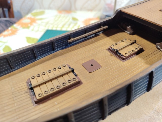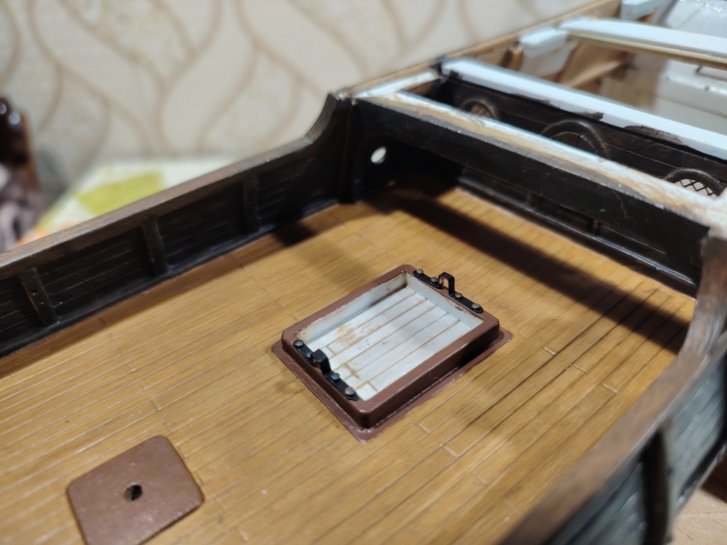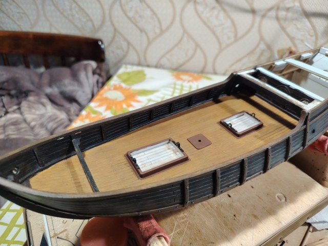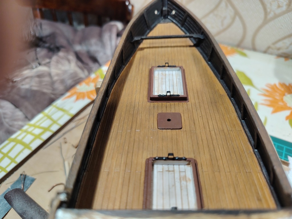 Родную палубу перевернул и оклеил "досками" из дошипластика. Теперь разметка-грузовой люк, рустерная решетка и остальное.