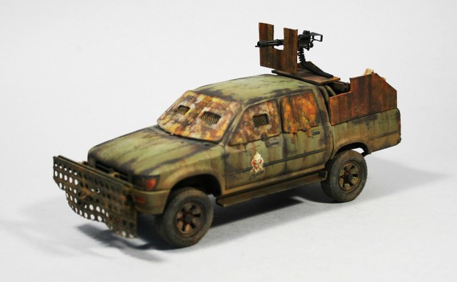 Накладные борта не толстоваты?(если это железо) И пулемёт. Я как понимаю он жёстко закреплён и не имеет приводов дистанционного управления. Тогда зачем щит? Потому как для стрелка, среди канистр и запаски, места не наблюдаю.