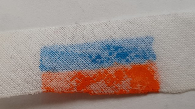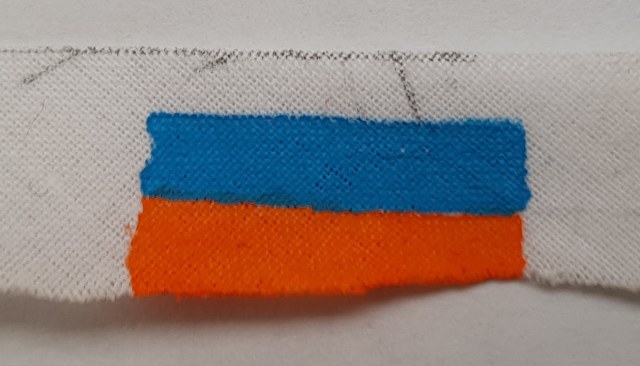 Вот, что у меня получилось. Ткань перкаль (наверное – была в наборе от Mamoli). Пропитана ПВА. Рисовал две полосы встык двумя цветами; сверху третья незакрашенная полоса (не ней следы карандаша от предыдущих операций – sorry). Рисовал кистью (синтетика), не особо стараясь. Судя по всему, рисовать надо аккуратно, не накладывая один цвет поверх другого (в моем случае голубая полоса перекрывает рыжую).