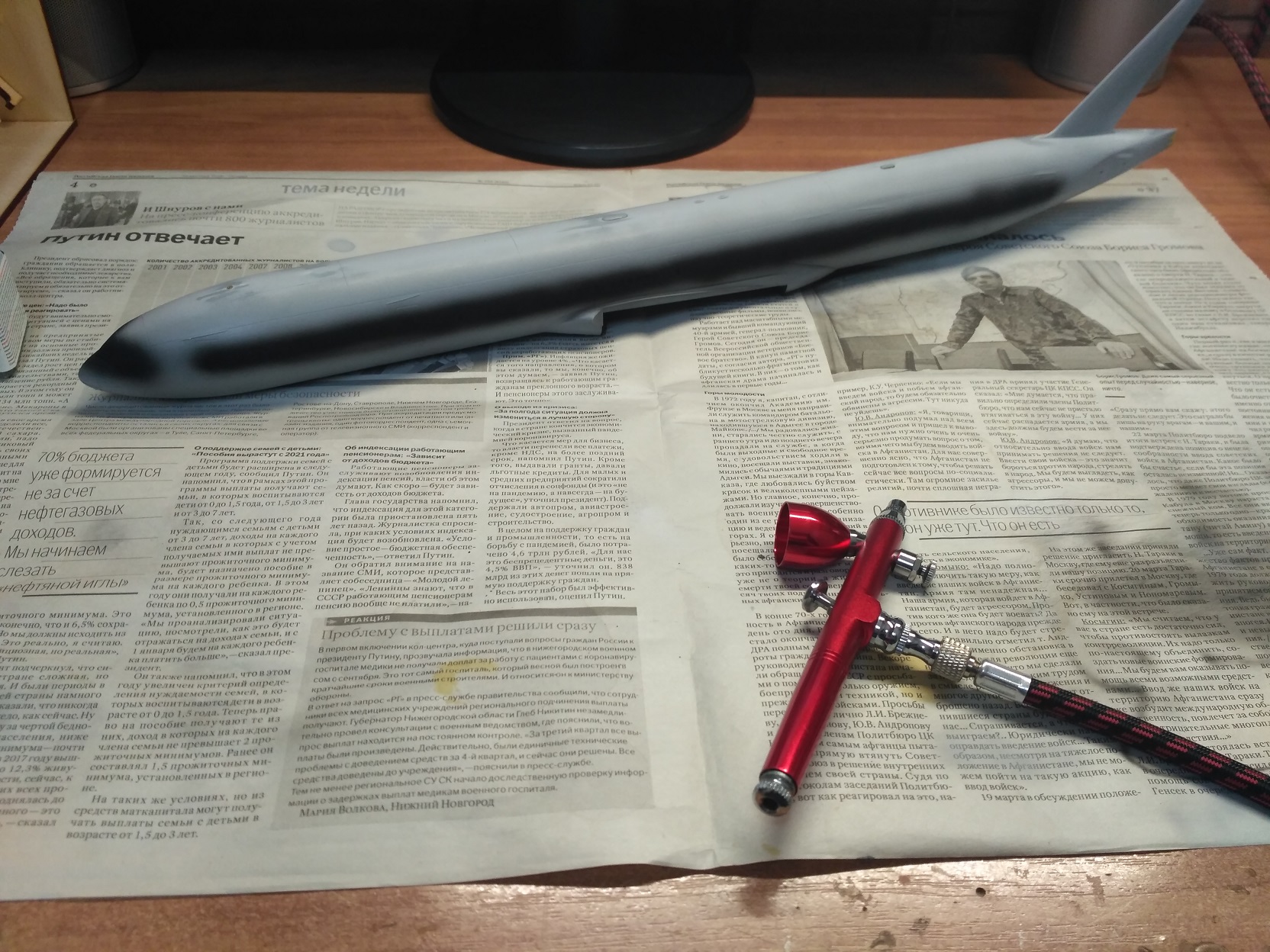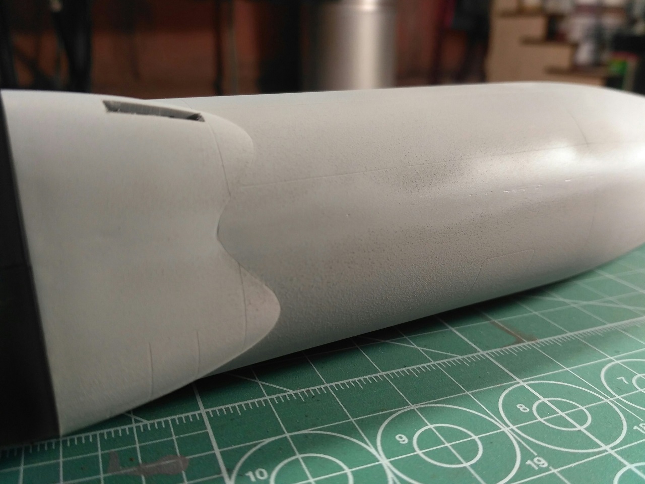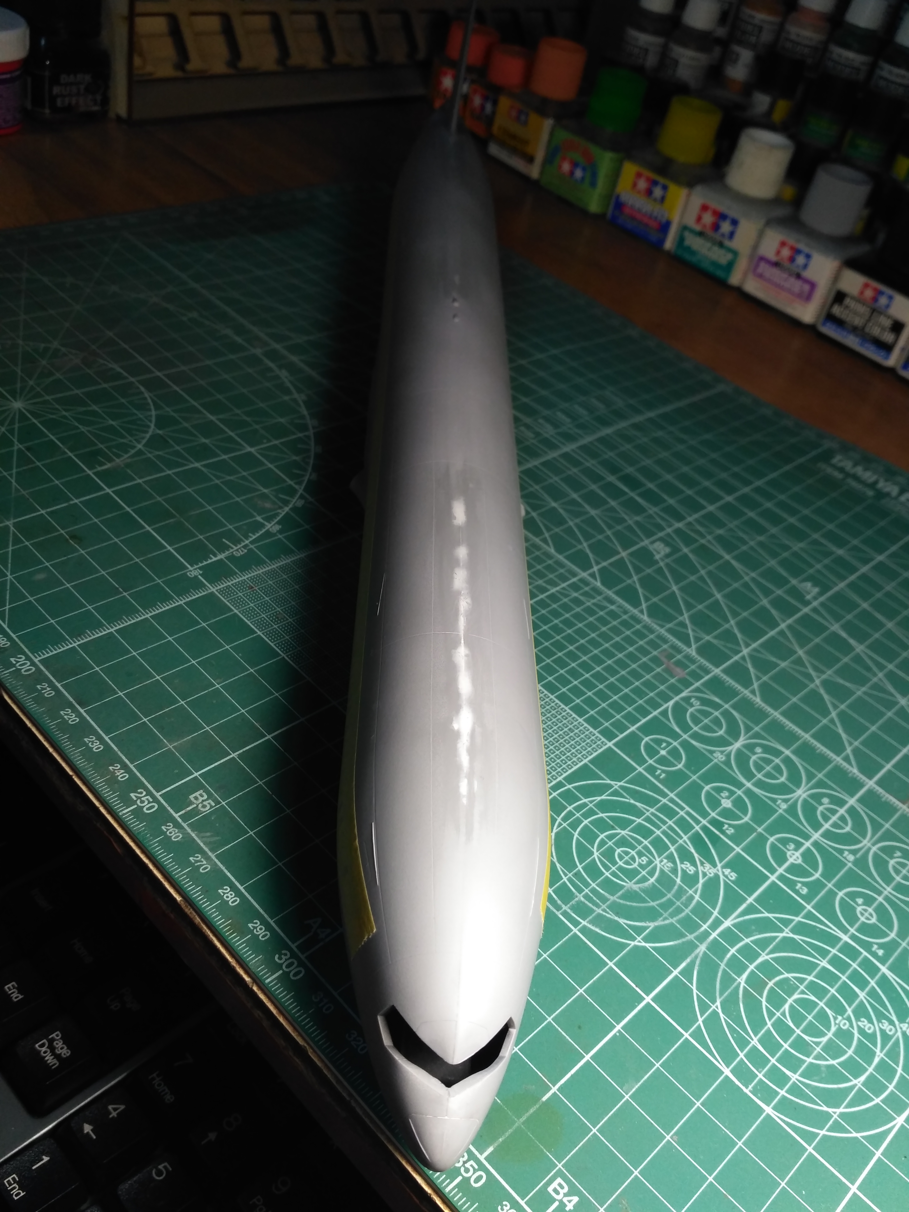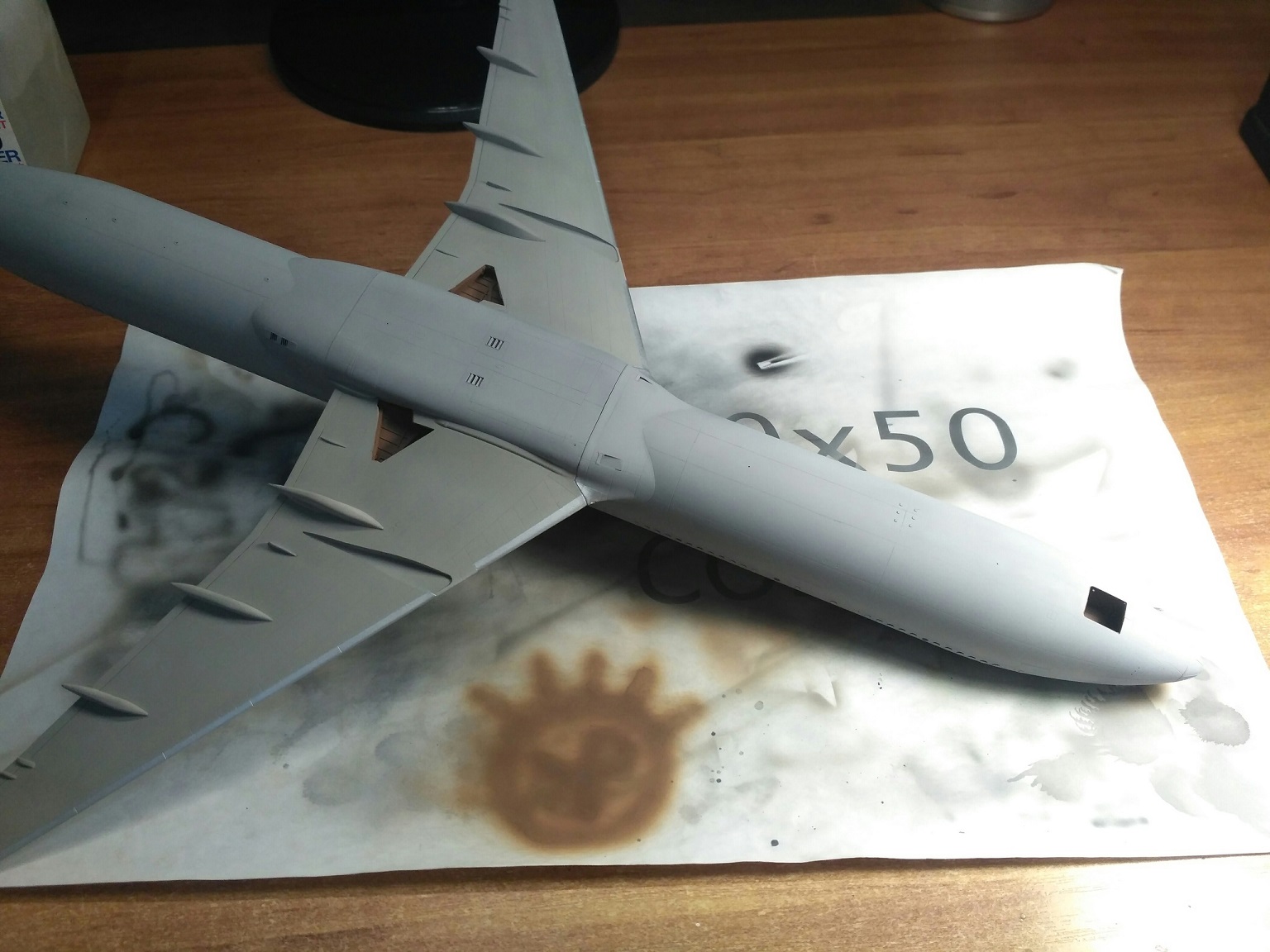 Сегодня фюзеляж очередной раз помыт с мылом, швы задуты грунтовкой, дабы выявить неровности. Сверху все хорошо, снизу нет.