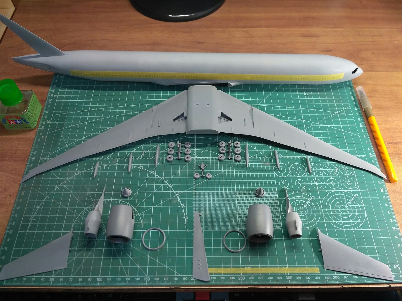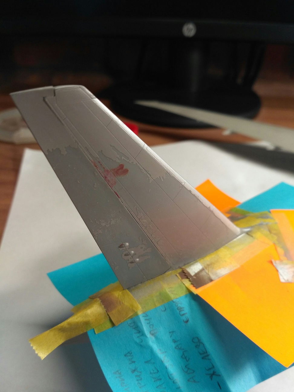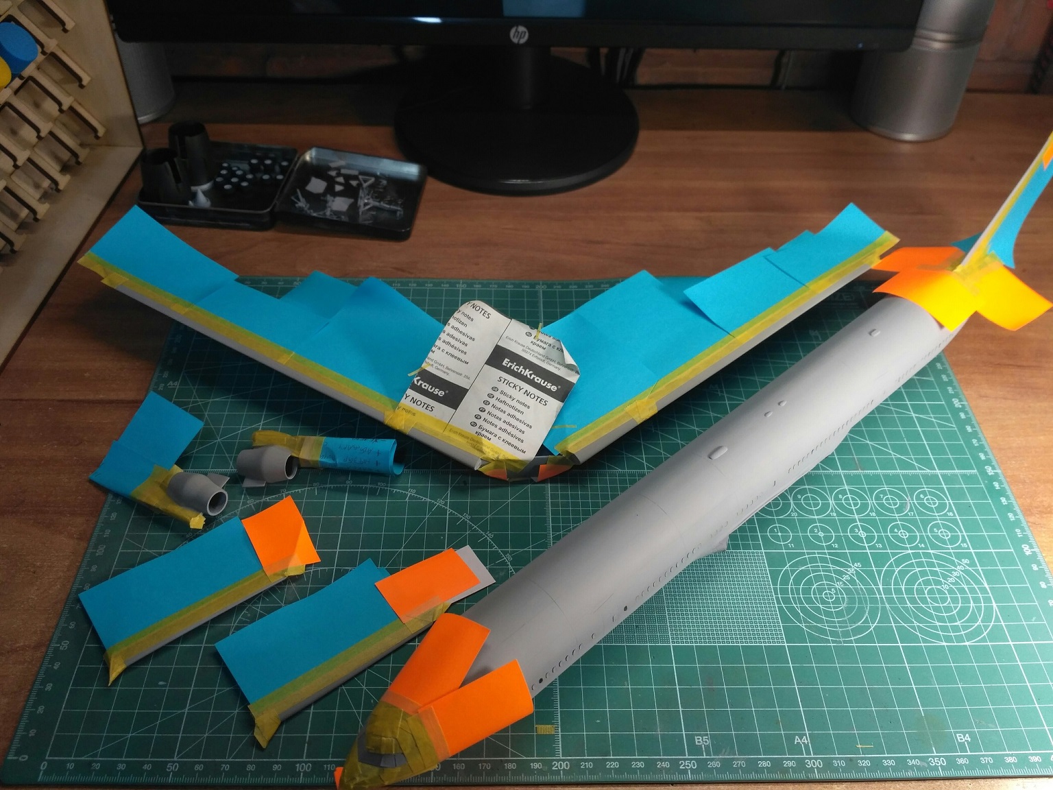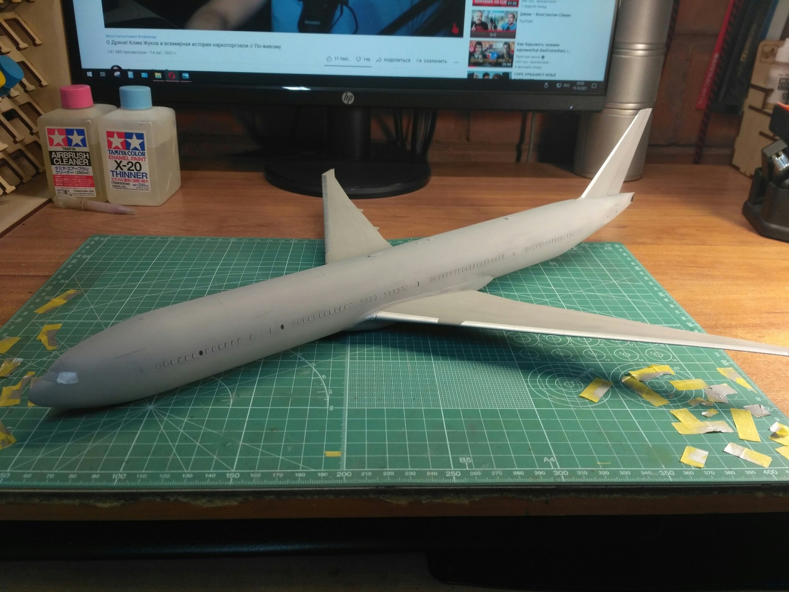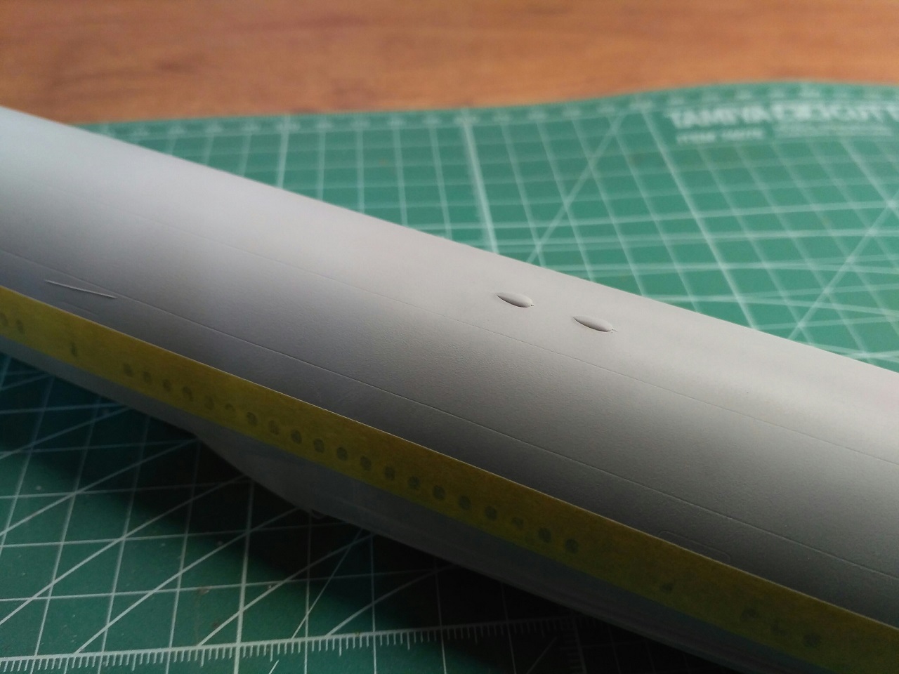 Сегодня фюзеляж очередной раз помыт с мылом, швы задуты грунтовкой, дабы выявить неровности. Сверху все хорошо, снизу нет.