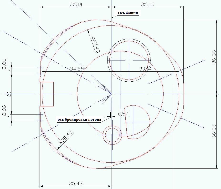 Окружность диаметром 67,43 мм - наружная граница бронировки погона , её ось смещена вперед относительно оси вращения башни на 0,57 мм.