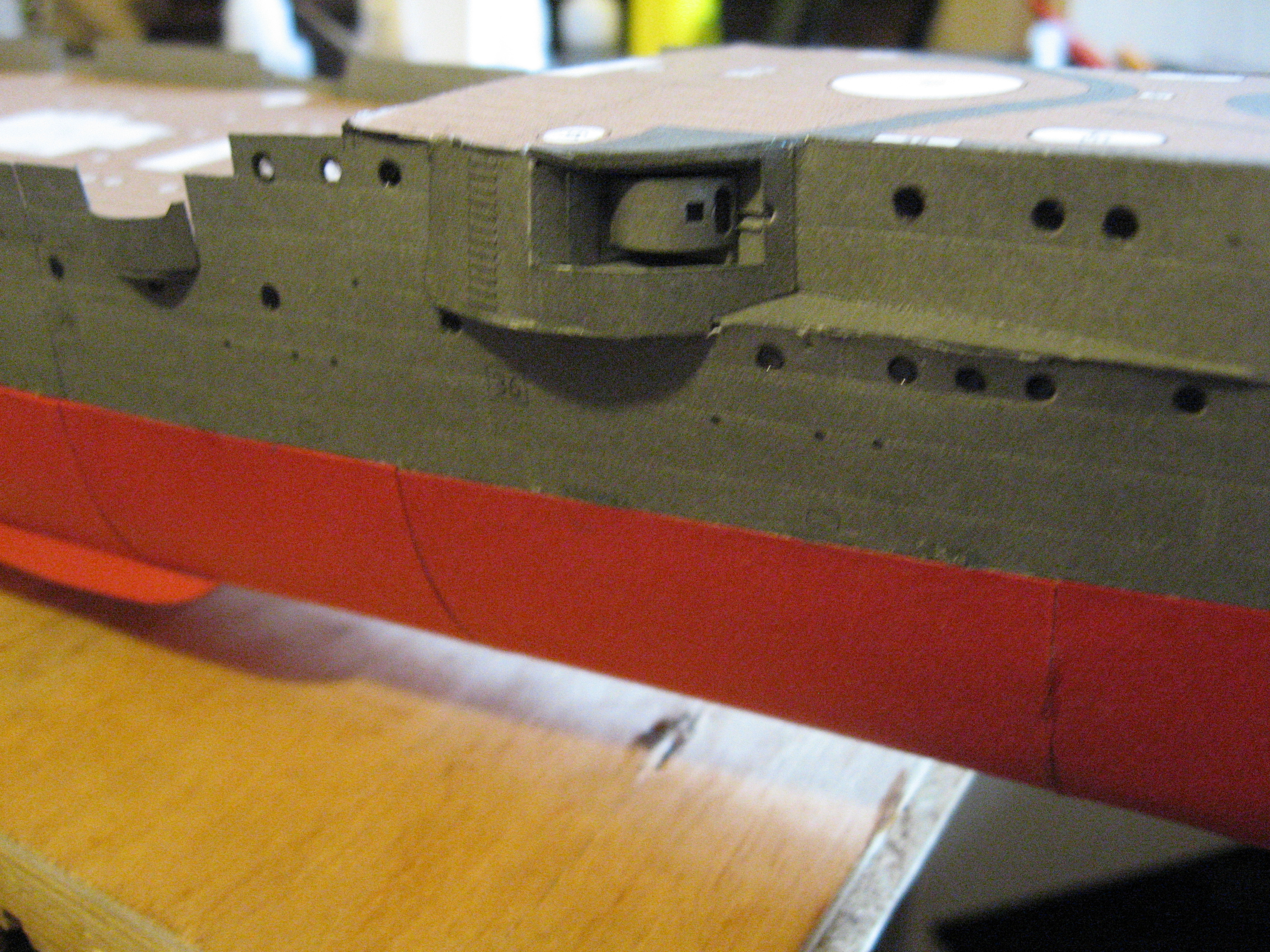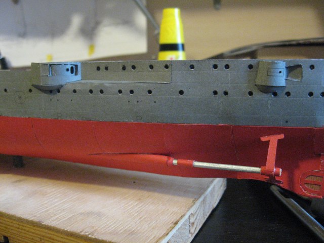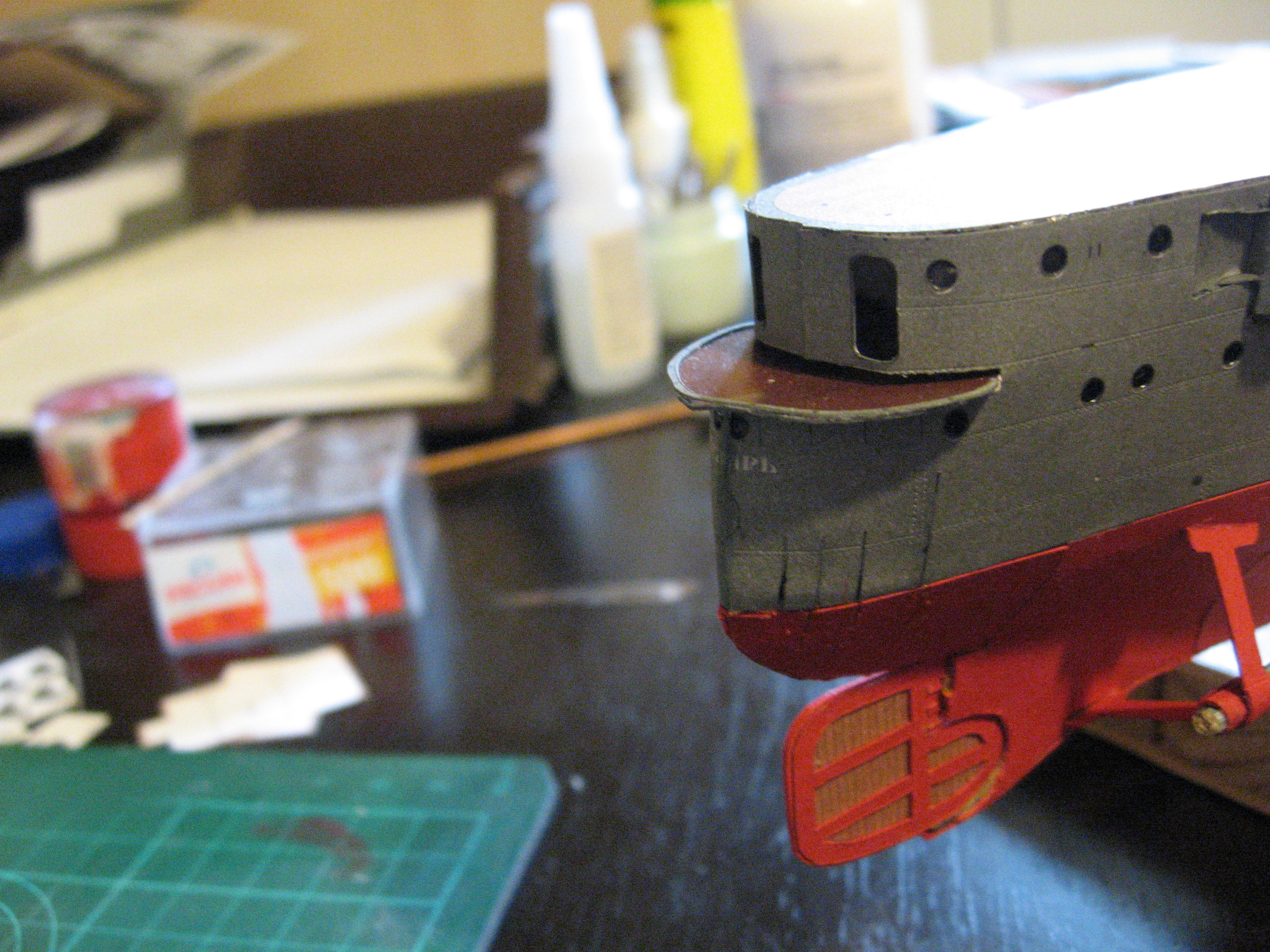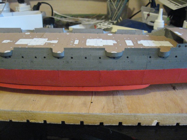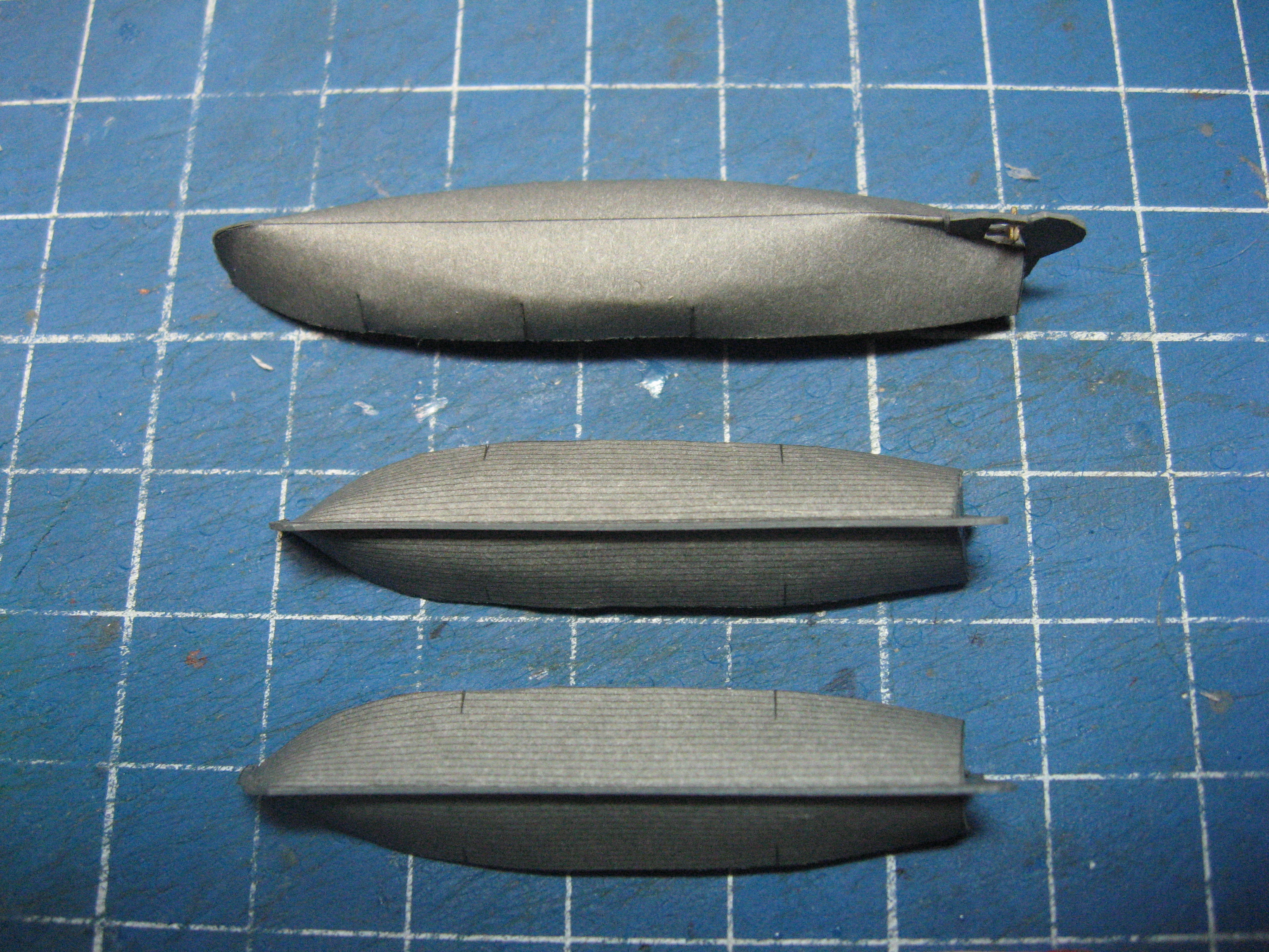 К сожалению сделал глупость, используя слишком толстый крашенный в массе ватман на днище . Плотность под 300 мало того что усложнила всю работу , так за счет большего внутреннего напряжения разверток при подсыхании немного уехала - что привело местами к щелям на стыке надводной и подводной части бортов , да и между листами тоже не все ровно . Но что есть то есть .
