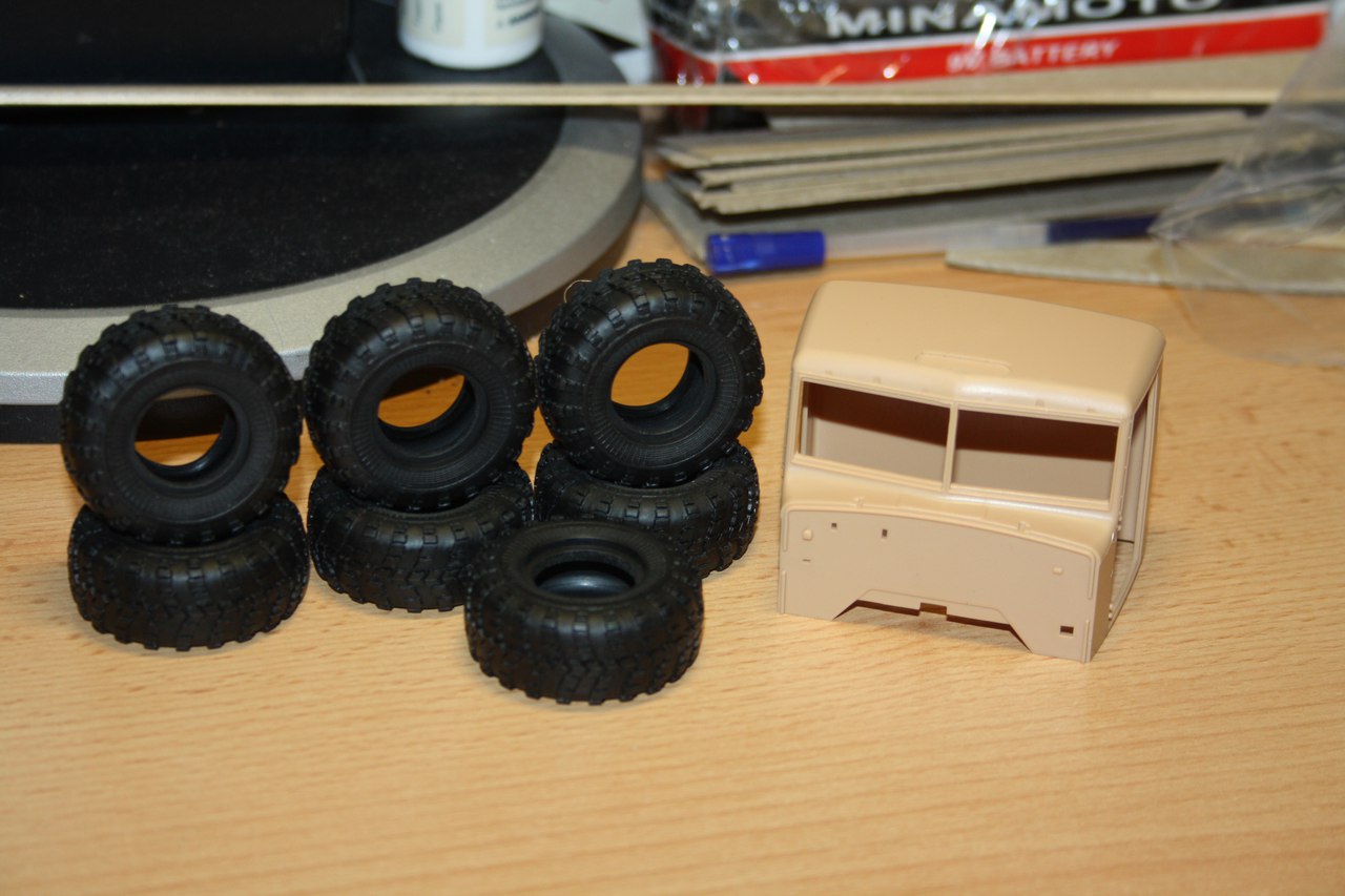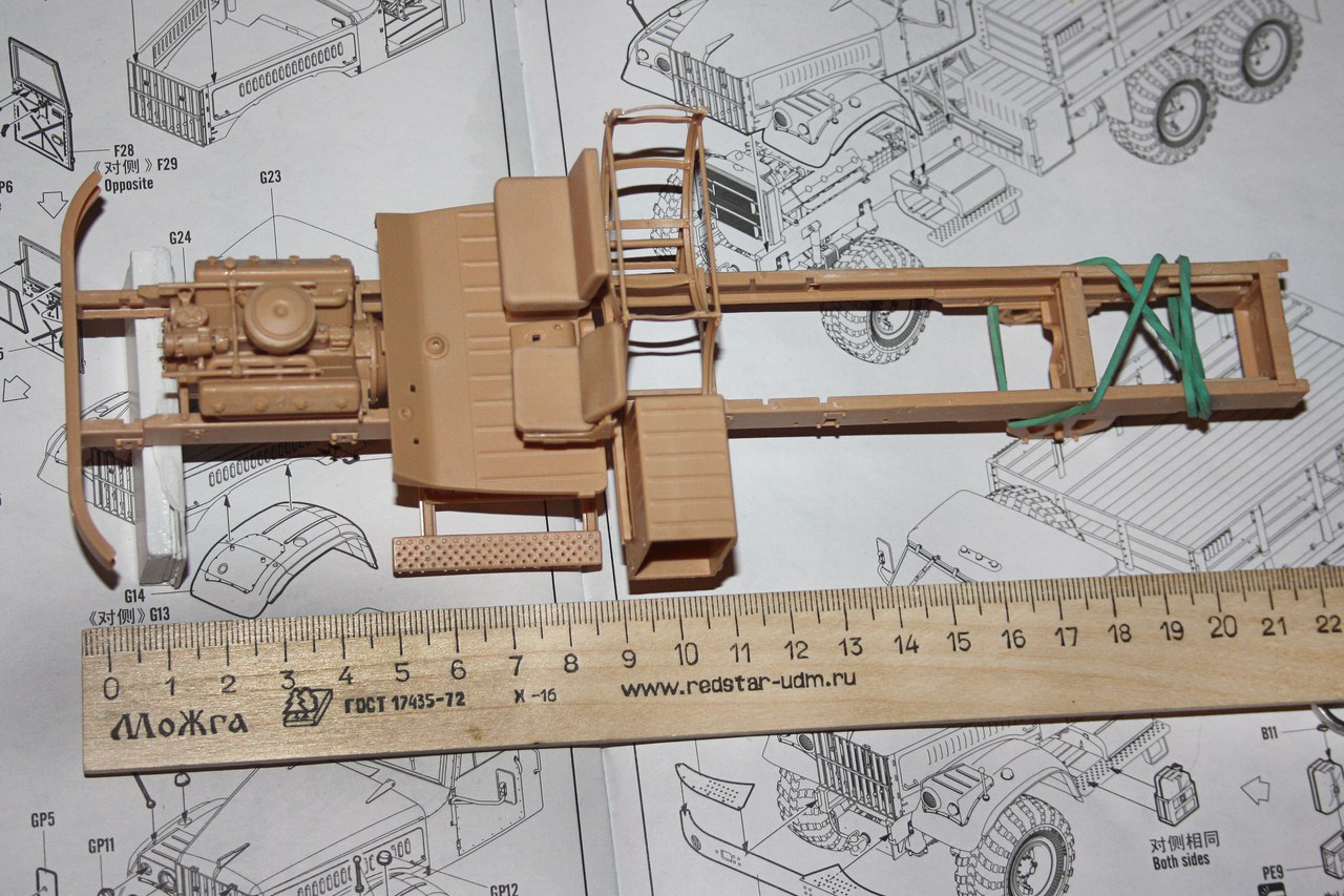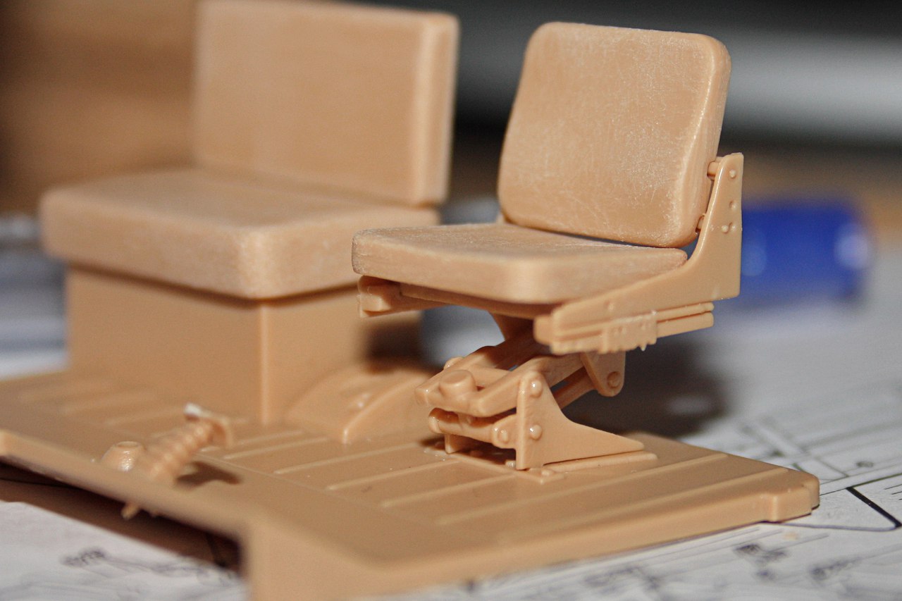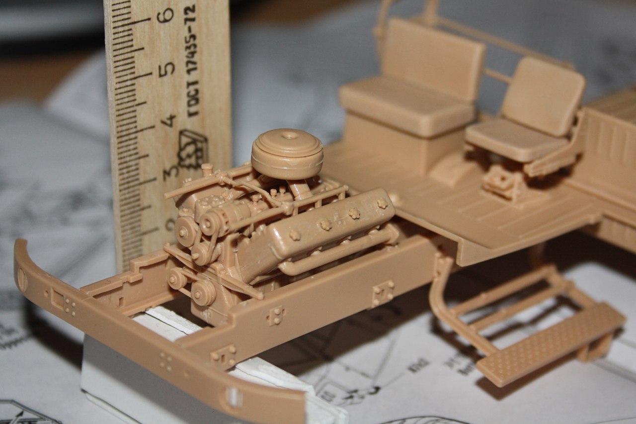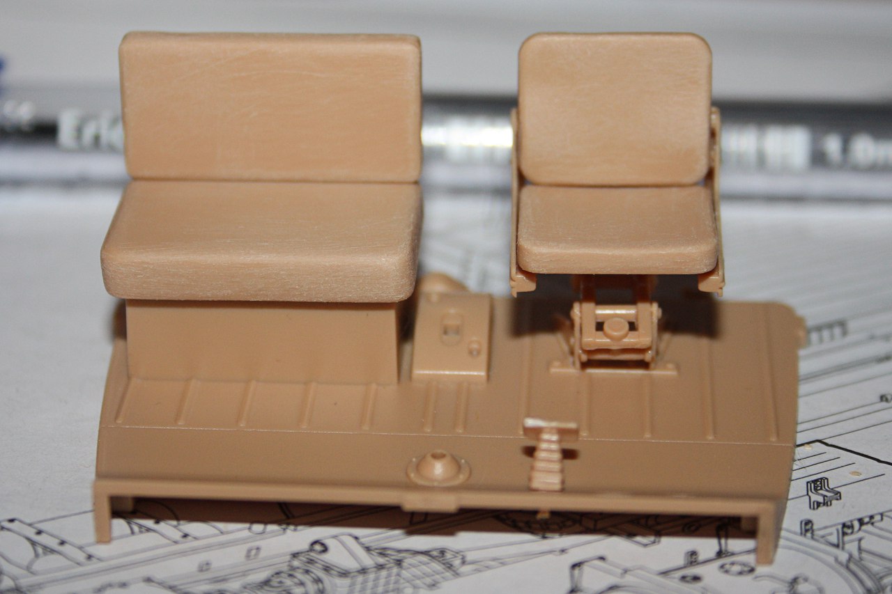 Продвижение по сборке, собрал сидушки, торпедо, с элементами пола и кабины пока не склеивал, также собрал держатель запасного колеса и задние мосты частично.