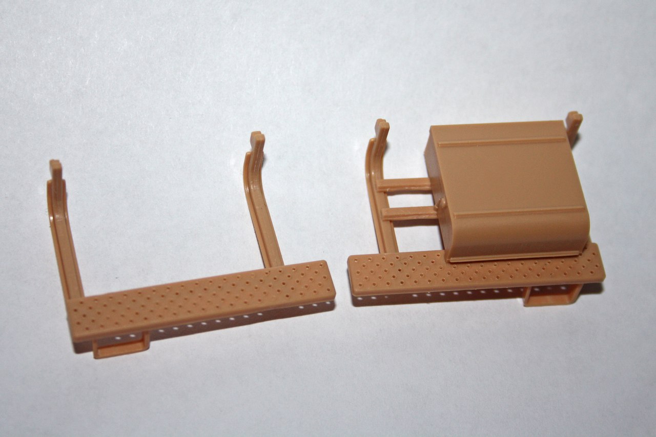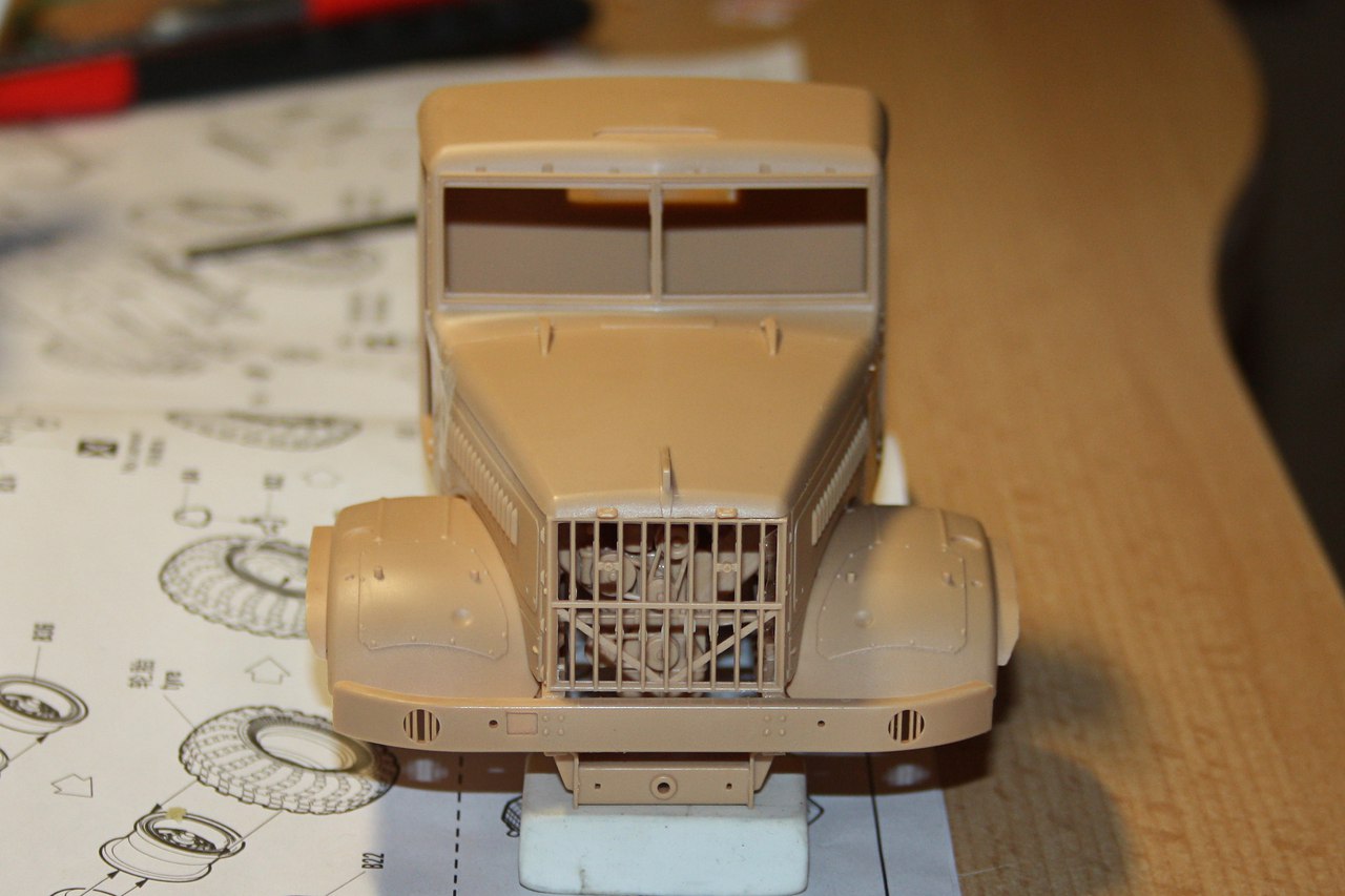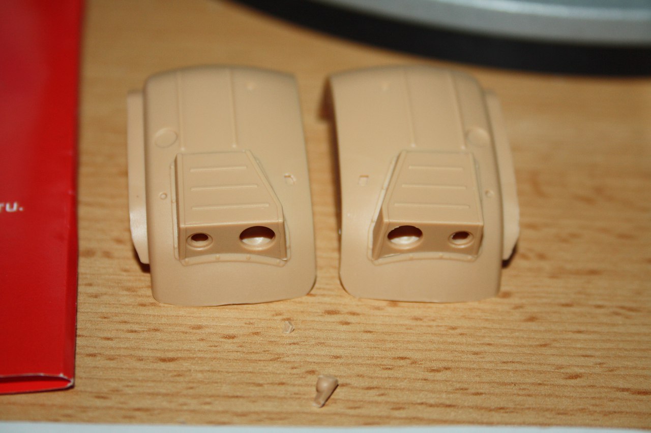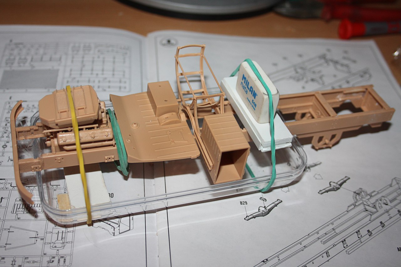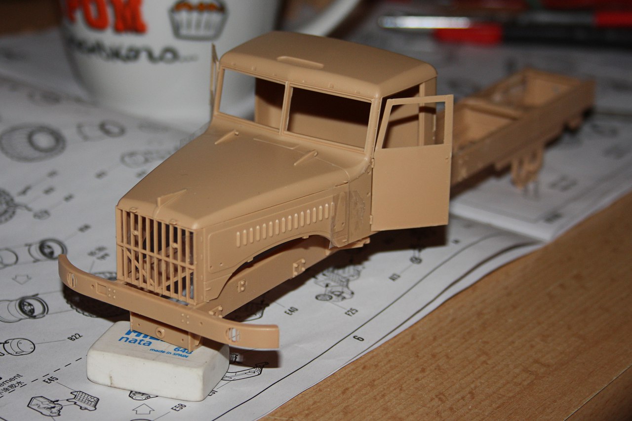 Продвижение по сборке, собрал сидушки, торпедо, с элементами пола и кабины пока не склеивал, также собрал держатель запасного колеса и задние мосты частично.