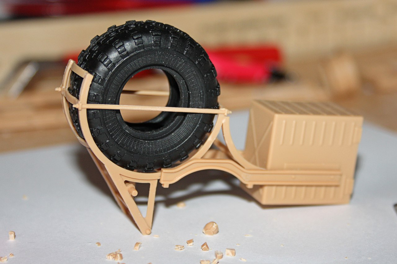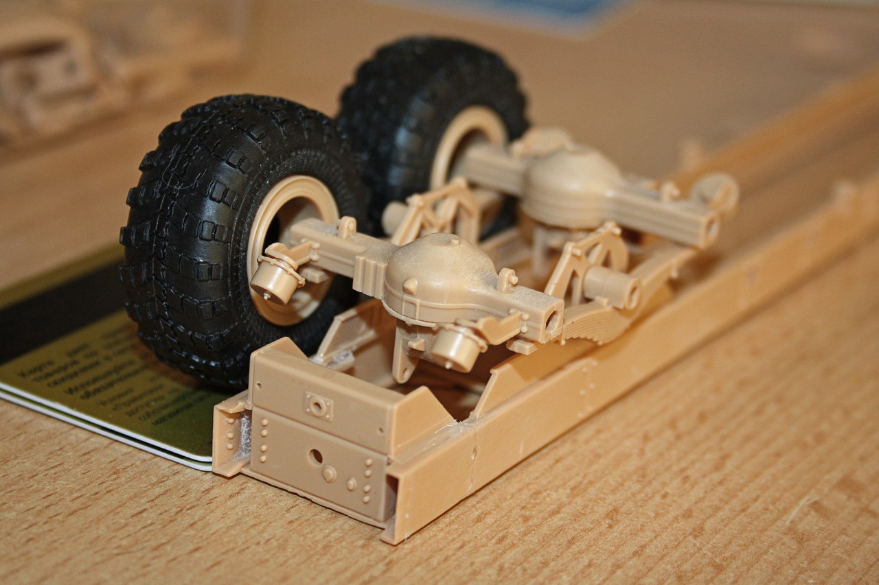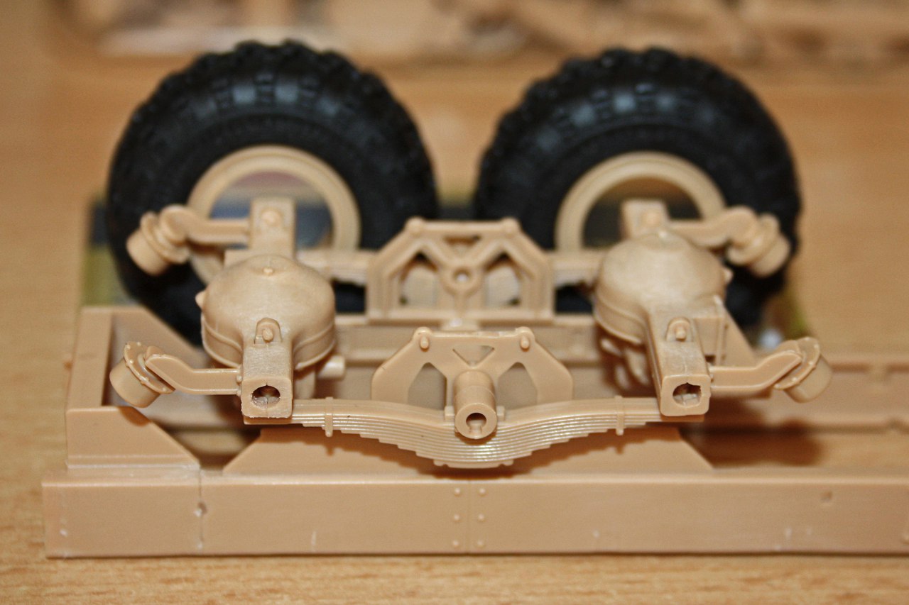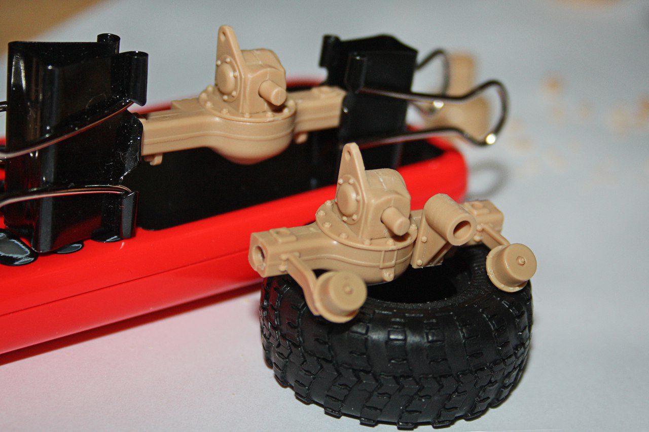 По конструкции изначально колеса не крутятся, а клеятся к мостам как я понимаю для стендового 35 масштаба это норма, я буду делать чтобы колеса крутились, в мостах сделал некоторые изменения, сквозное отверстие через мост чтобы пропустить ось колес.