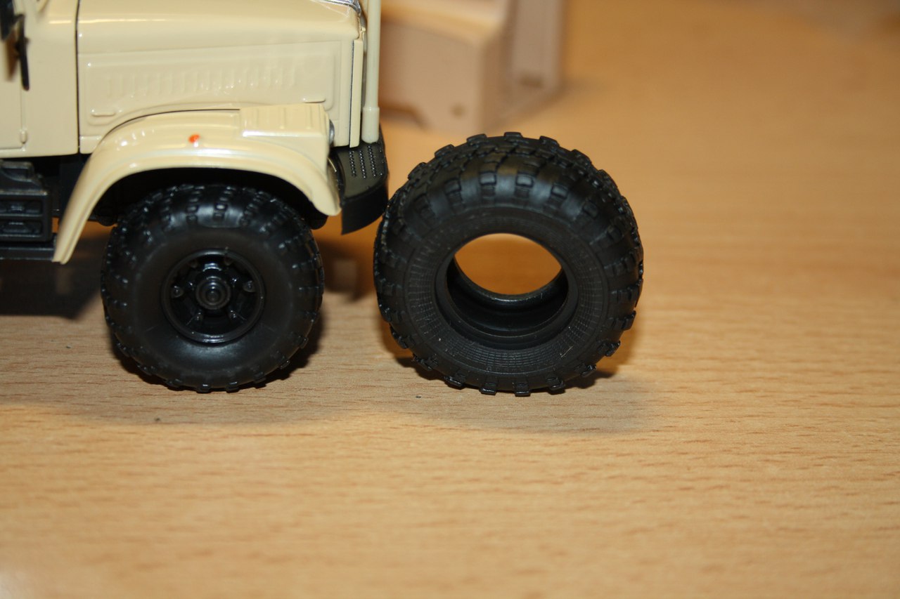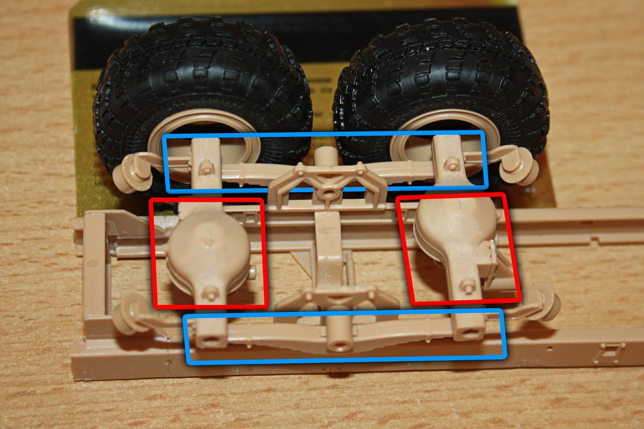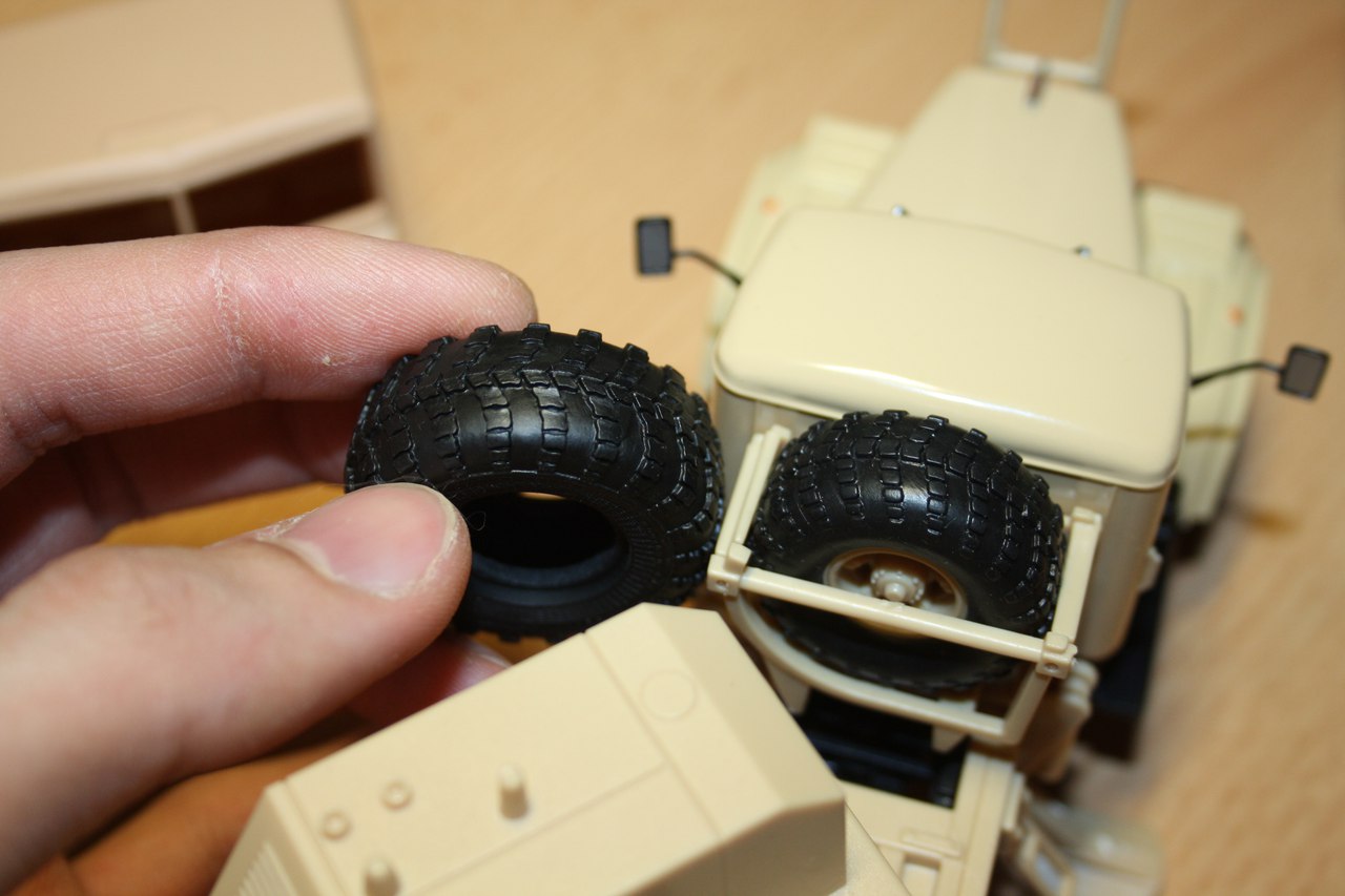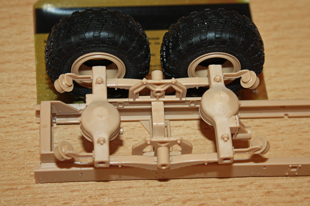 По конструкции изначально колеса не крутятся, а клеятся к мостам как я понимаю для стендового 35 масштаба это норма, я буду делать чтобы колеса крутились, в мостах сделал некоторые изменения, сквозное отверстие через мост чтобы пропустить ось колес.