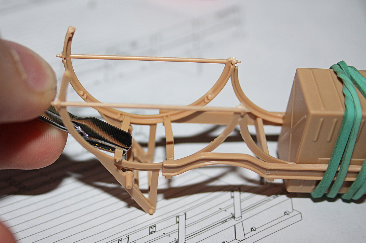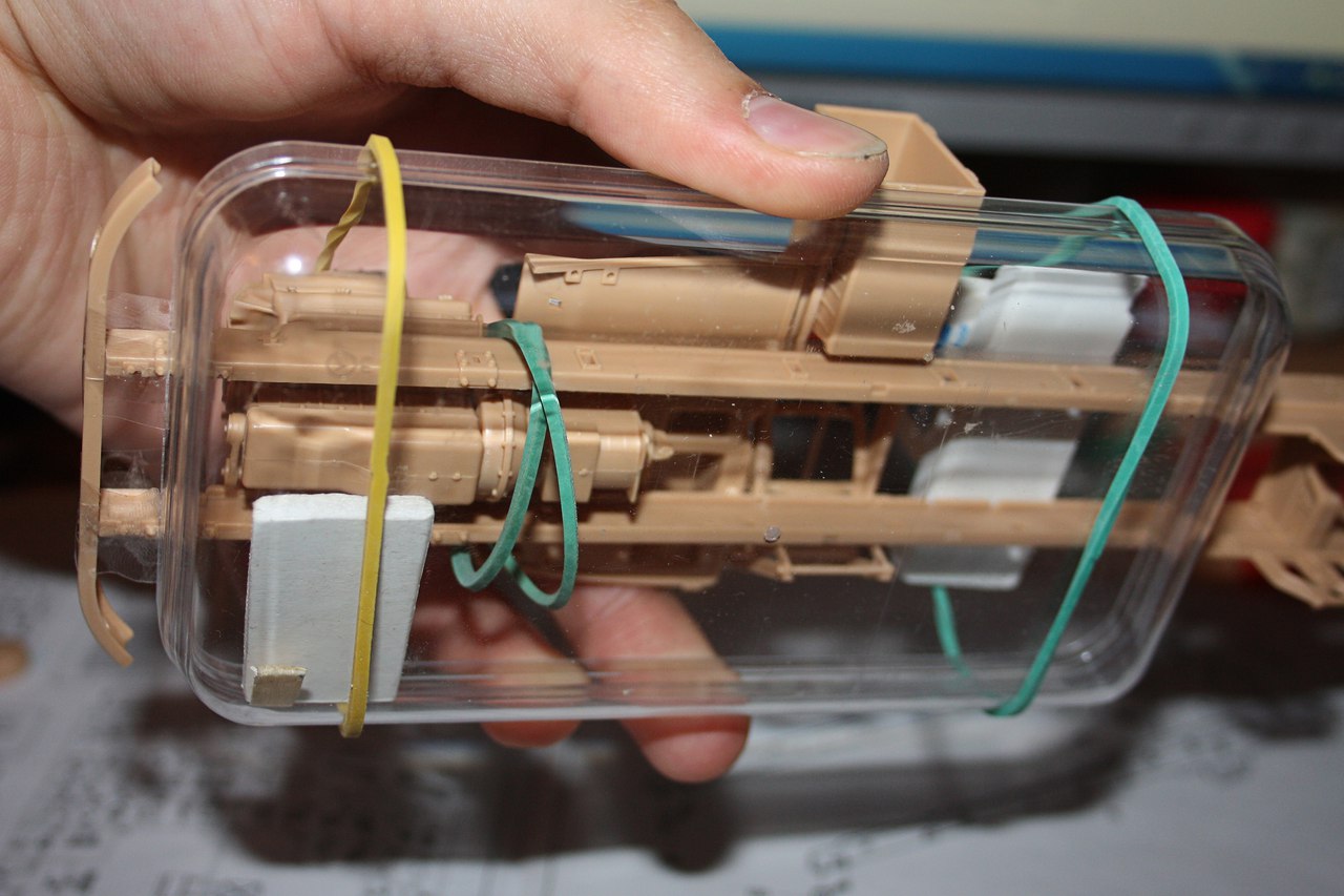Левая и права части рамы соединяются между собой с внутренней стороны через не знаю как правильно называются... промежуточные части рамы сзади в двух местах, и спереди бампером, также раму фиксирует от гуляния пол кабины, двигатель, держатель запасного колеса, но даже при такой навески деталей, все ровно левая и правая половинка рамы немного гуляет относительно друг друга при сборке, может за счет того, что пластик гибкий..., сделал вот такую конструкцию, резинки здесь, для того чтобы прижать к раме пол кабины и двигатель, чтобы они не сваливались так как не приклеены и удерживали, потом склеил начиная с задних промежуточных вставок, потом вклеил бампер.