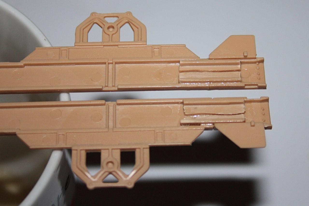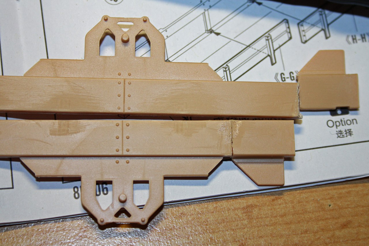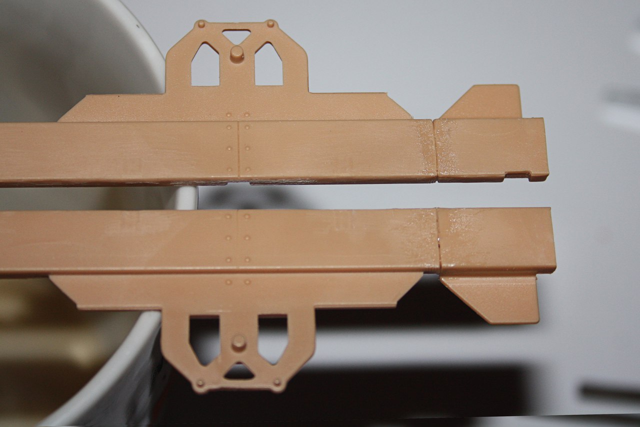 Также укоротил раму, под длину седельного тягача. Вырезал кусок рамы, склеил между собой основную часть и окончание из вырезанного куска вклеил с внутренней стороны усиления, щели между кусками, а также места с внутренней стороны для усиления просыпал содой с секундным клеем, потом все лицевой стороны (на фото соды с клеем и вышкуренной рамы ещё нет)
