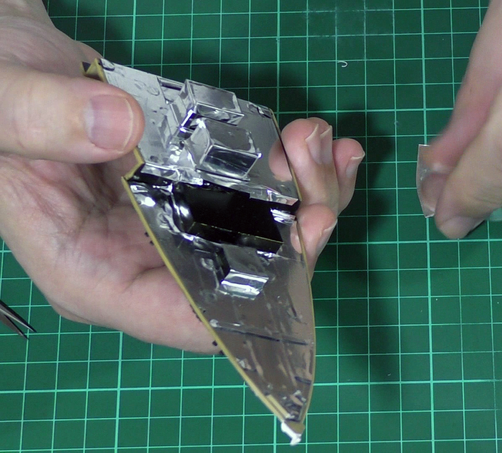 Немного прогресса. Днище бака закрыл фольгой самоклейкой, чтобы палуба не просвечивала, но перед этим ещё закрасил в чёрный цвет. Далее поменял родные якоря на смоляные, более правильные. Установил на цепь звеном 1,5 мм. Продел через клюзы и провёл на бак. Видео сможете скоро посмотреть на каропке у меня в файлах.
