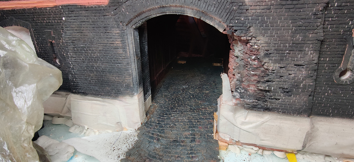 Затем сделал мостовую под аркой. Раскатал блин из запекаемой глины и наковырял булыжников: