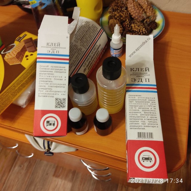 Помирать лучше в темпе. Бо сие чудо после вскрытия резко начинает портиться. Отвердитель, хапнув из атмосферы воздуха, выходит из строя. И потом смола не полимеризуется.В самую пору вспомнить поговорки :