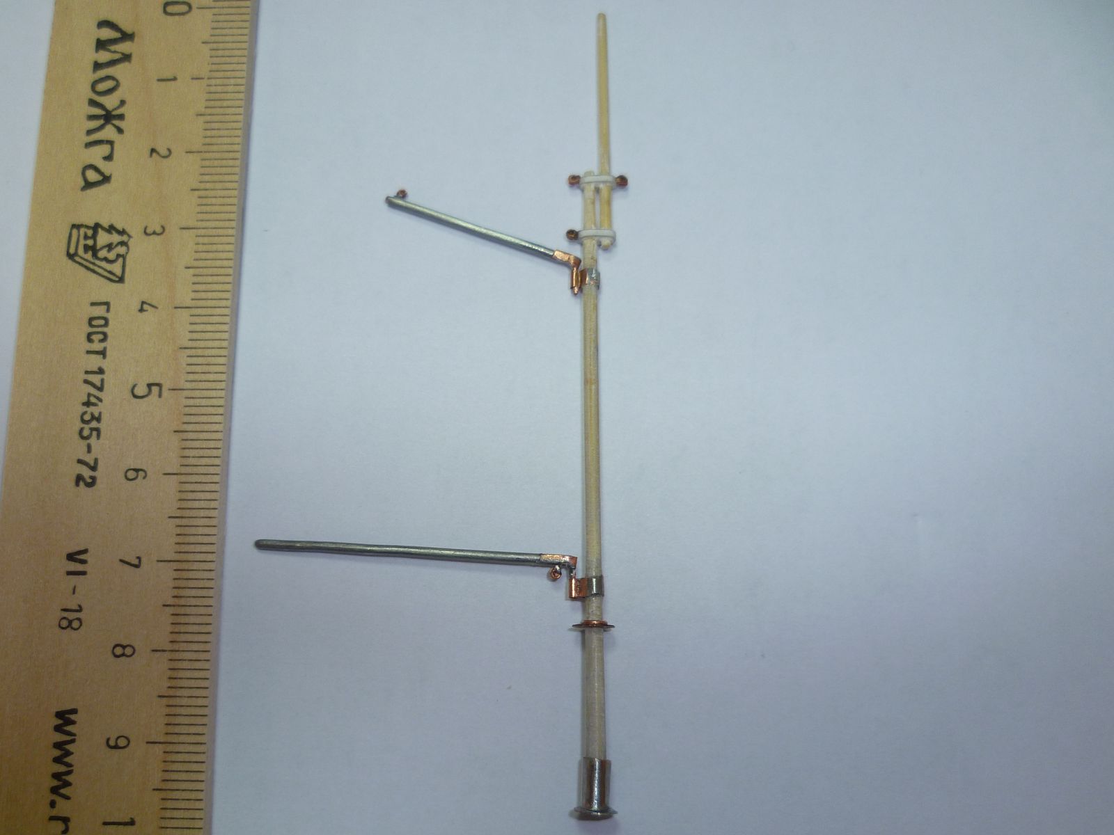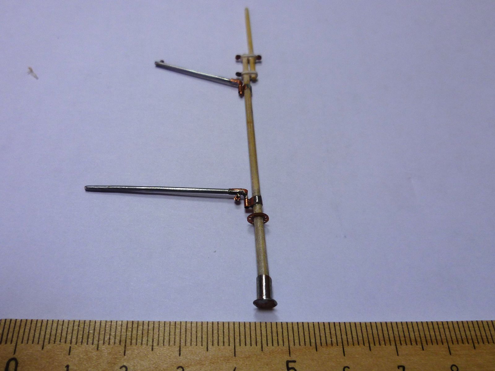 Сделал мачту из бамбуковой шпажки, зубочистки и канцелярских скрепок. Имитацию блоков и кофель нагельной планки вытравил. Собираю детали для массовой покраски в белый цвет.