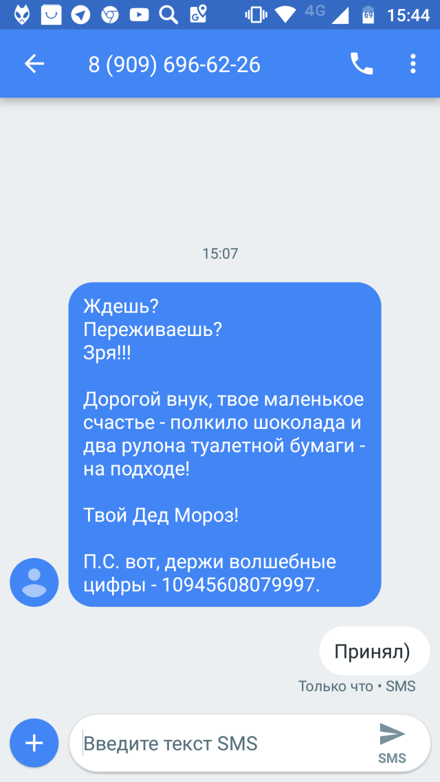 Приходит мне СМС с неизвестного номера: И какое же было у меня удивление, когда почта отобразила, что там 3.5кг шоколада и туалетной бумаги. Всё равно в хозяйстве сгодится.