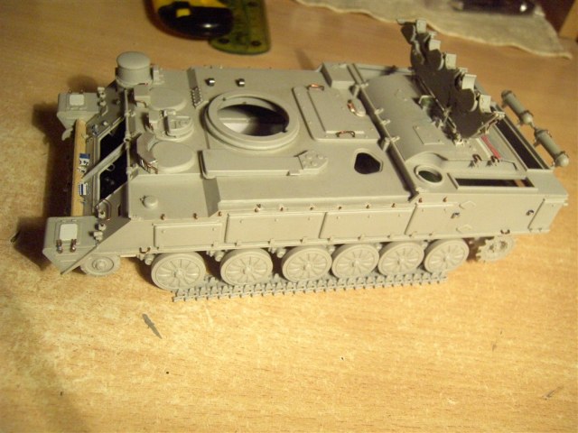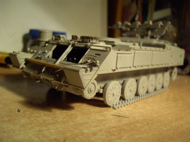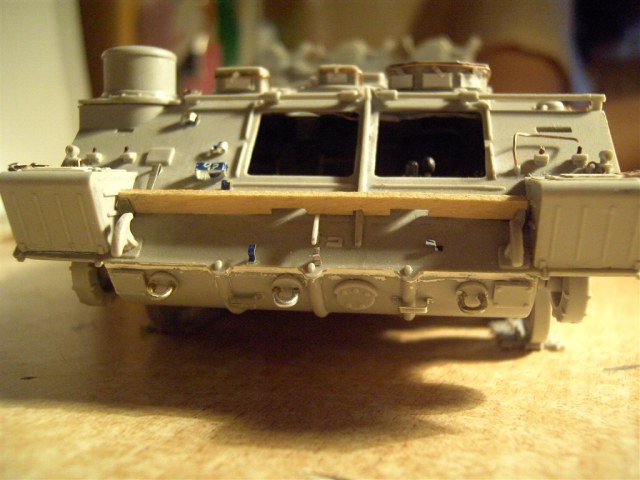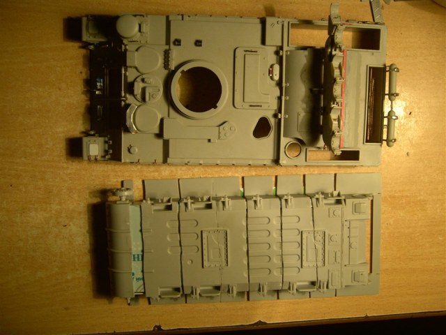 "Стыковка" прошла успешно. После шпаклевки доделал буксировочные петли и ступеньки на нижней лобовой детали.