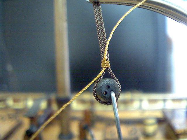 Грот-булини ведут вперед через snatch-шкив, прибитый к планширю впереди кат-балки, а затем возвращают в сторону кормы, чтобы закрепить на крюйсове в спиткетинге форкастля. не очень складный перевод, но может как то поможет