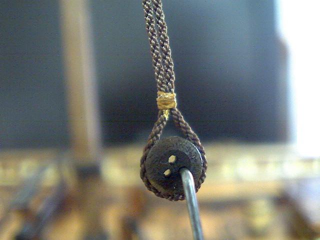 The main bowlines lead forward through a snatch-sheave nailed to the planksheer forward of the cathead, and then return aft to be belayed at a kevel in the forecastle spirketting.