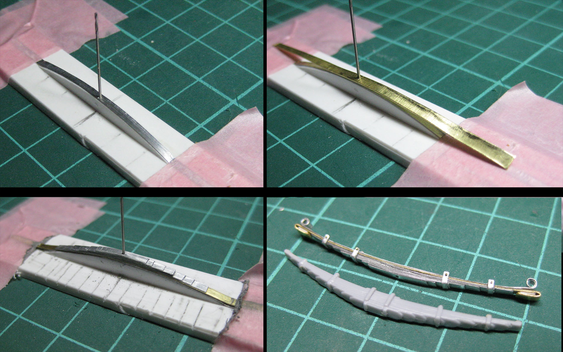 Не прошло и трех лет, и появляются новости о этой стройке. Продолжая работать над ходовой, и оглядев рессоры из набора ГАЗ-66, не совсем доволен отливкой с утяжинами. И решил попробовать набрать рессоры самостоятельно. Вторую рессору сделал из жесткой латуни, дабы помочь удержать вес модели.