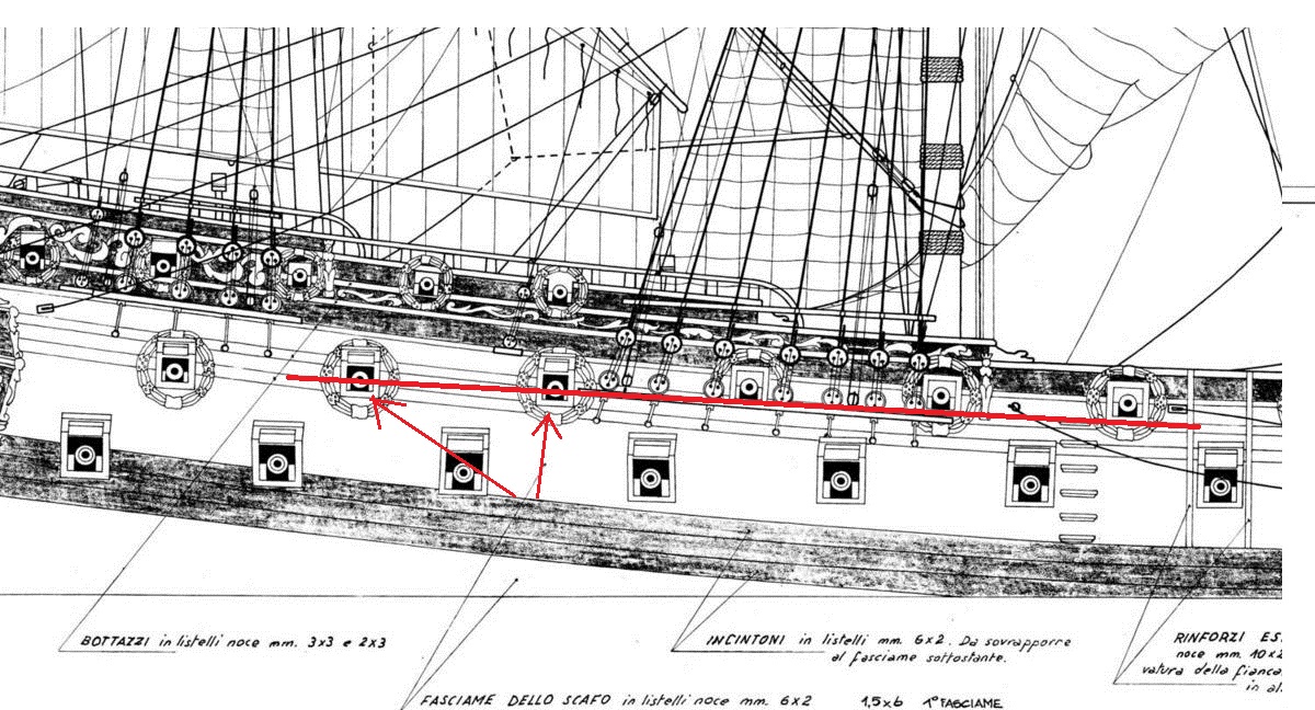 1. На чертеже порты идут не так чтобы в одну линию( выше я приводил лист боковой проекции, где видно что он вант грот-мачты и до кормы порты на 2-3мм ниже чем на палубе) как мне кажется, это не совсем законно, или же такое имело место быть?