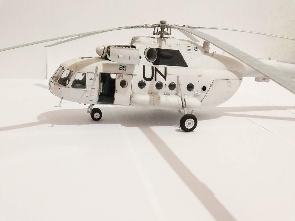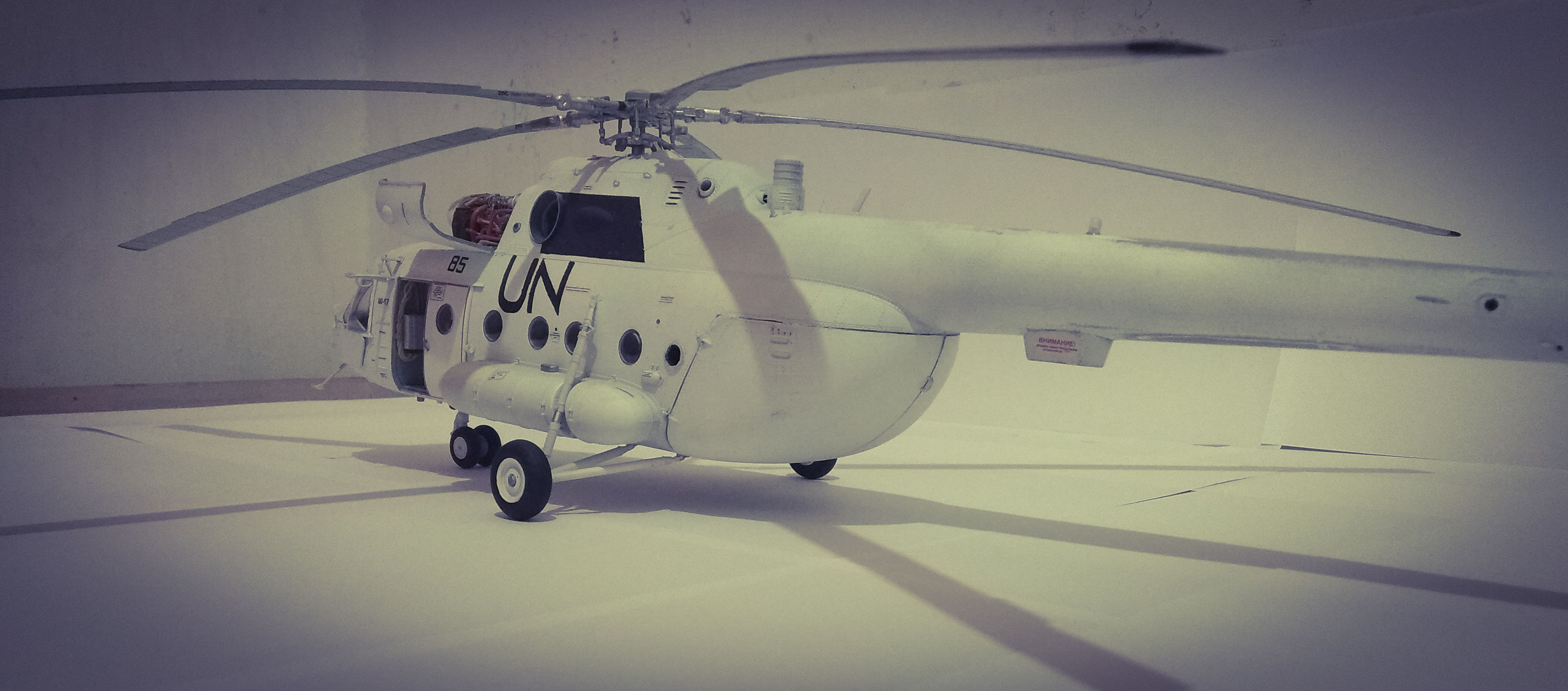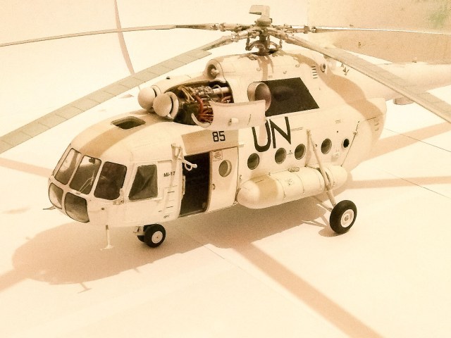 Модель мне досталась в качестве подарка в день рождения в паре с Ми-24 того же масштаба в 2013 году. В настоящее время модель выполнена на 70%, образ модели собирательный, машина относится к авиации United Nations. Фото в ближайшее время будут. Буду рад любым советам!