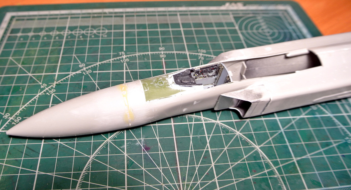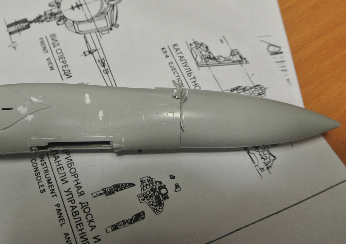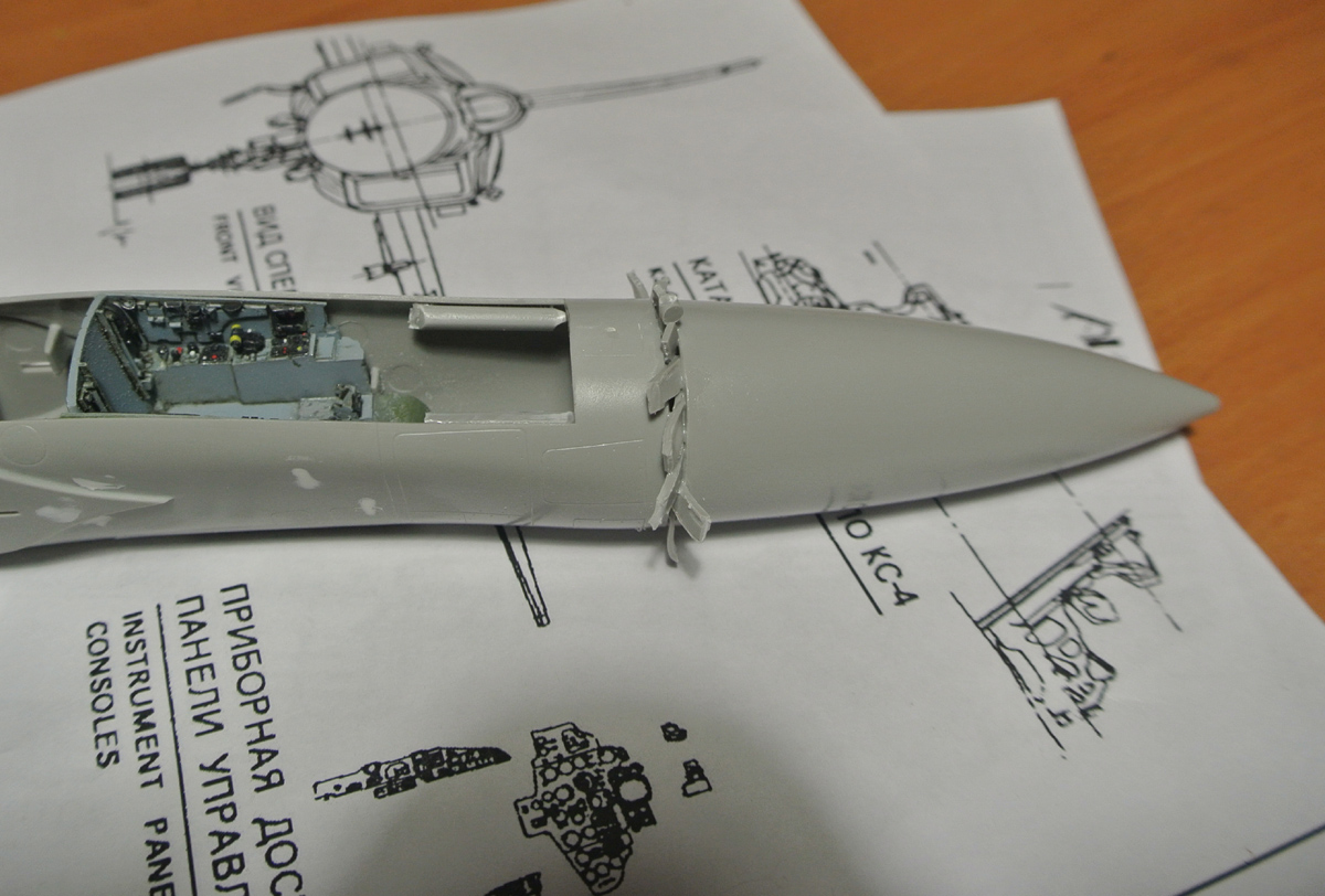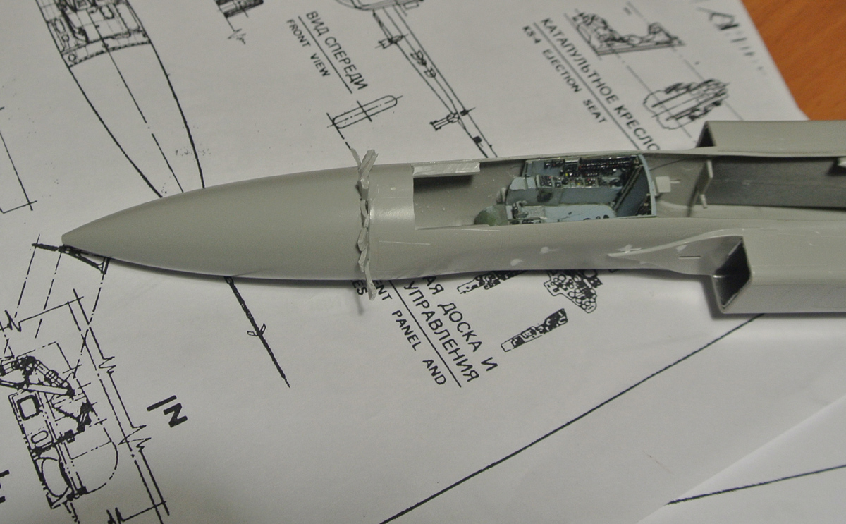 Продолжим. Зачистил место соединения конуса и фюзеляжа, приклеил панель перед кабиной пилота, вместе с ней приборную доску, расписал ее предварительно немного. На фото жалко не особо видно, как она получилась, попробую потом перефоткать. Приклеил воздухозаборники. Еще заделал отверстия под фары в крыльях кусками литника.