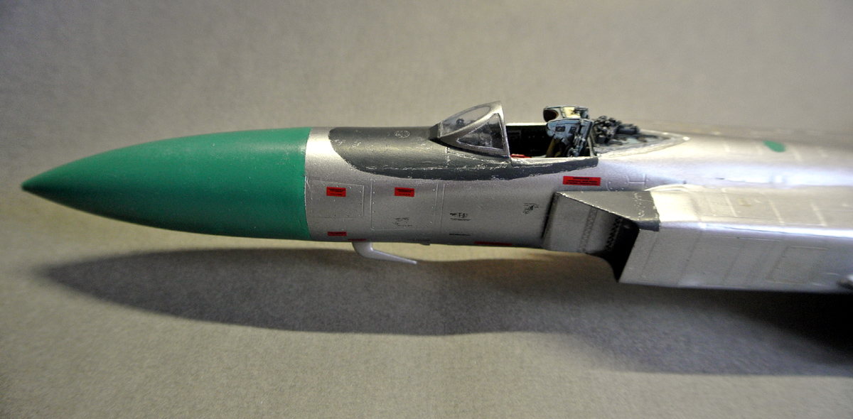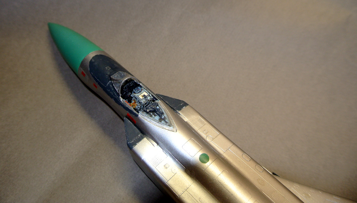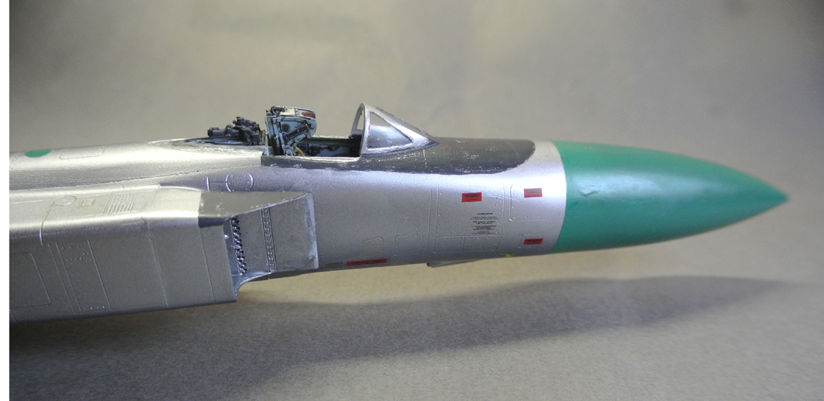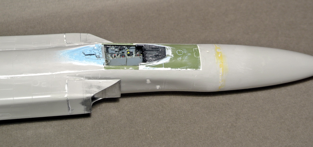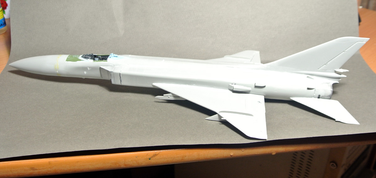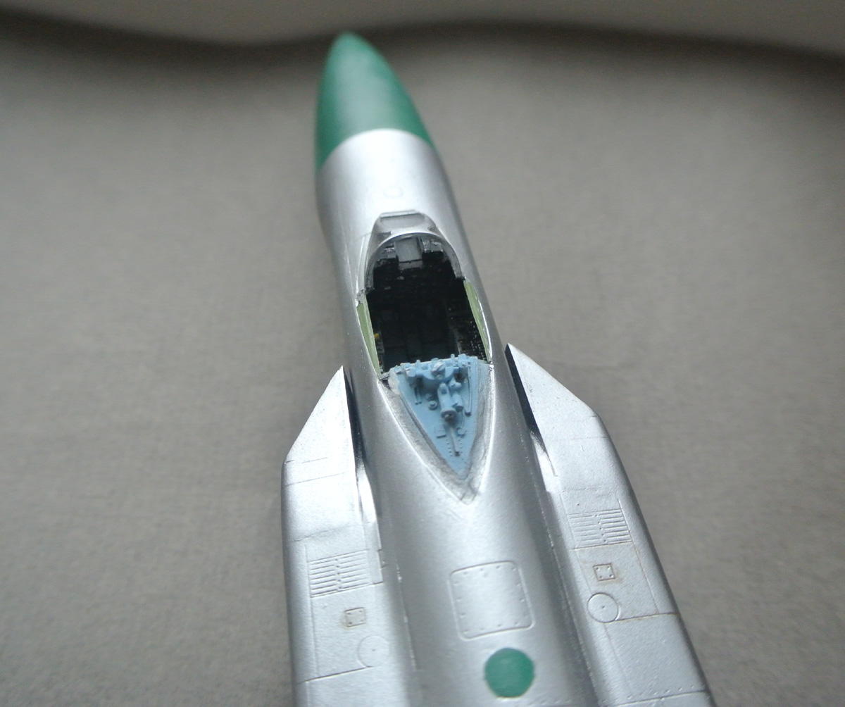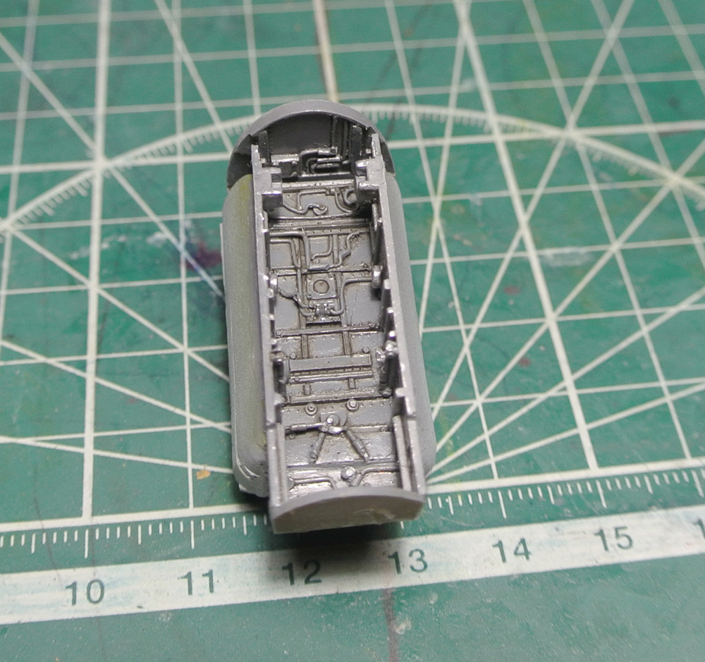 Загрунтовал, покрасил ниши осн. стоек шасси, конус, верх киля. Сдвижную часть фонаря приклеил временно, для удобства, потом ее установлю в открытое положение.