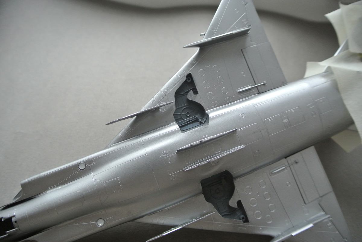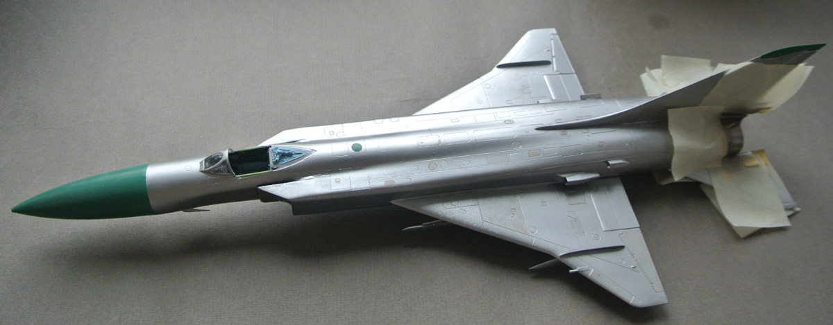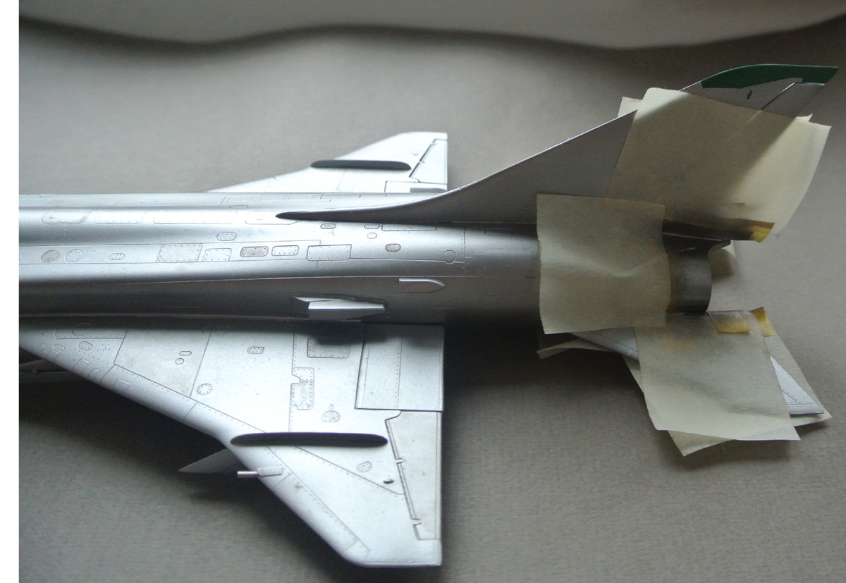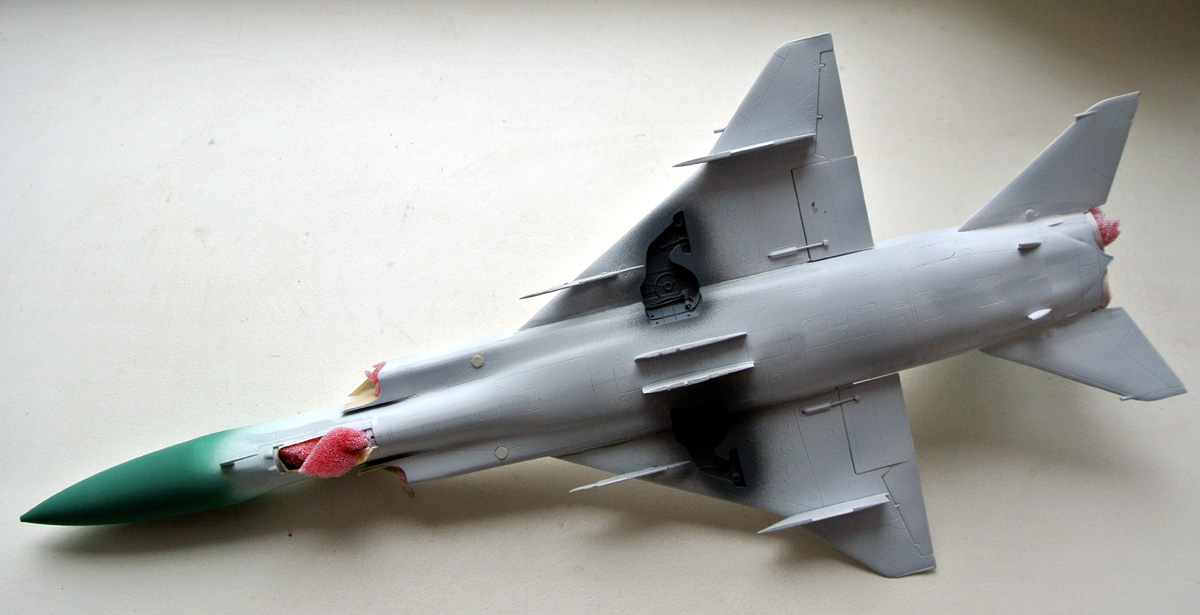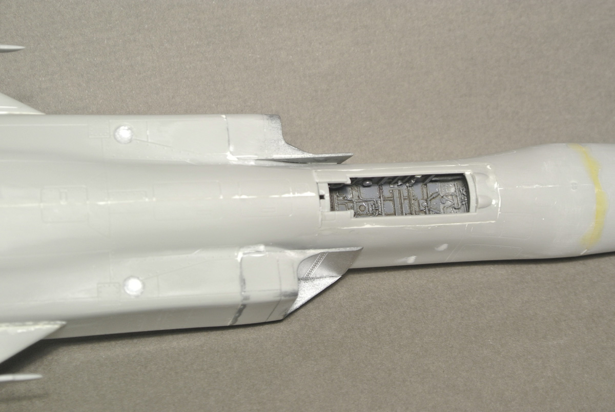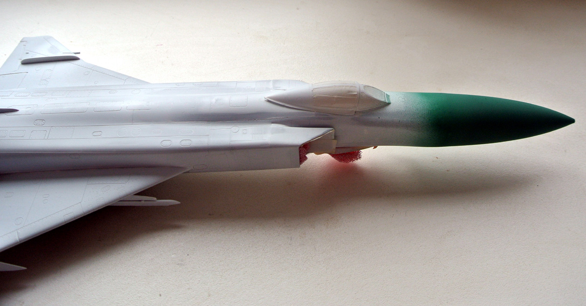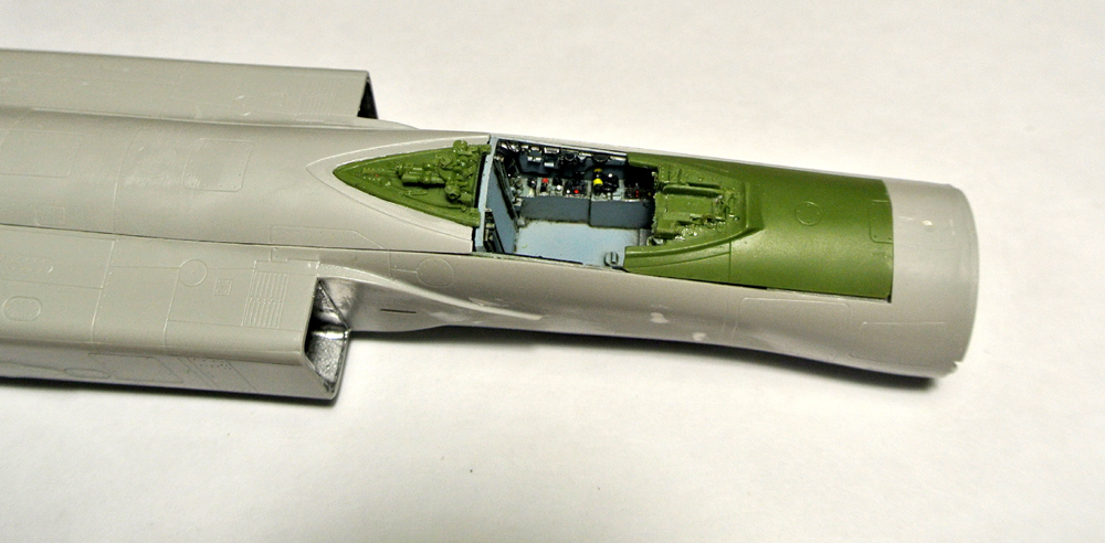 Загрунтовал, покрасил ниши осн. стоек шасси, конус, верх киля. Сдвижную часть фонаря приклеил временно, для удобства, потом ее установлю в открытое положение.