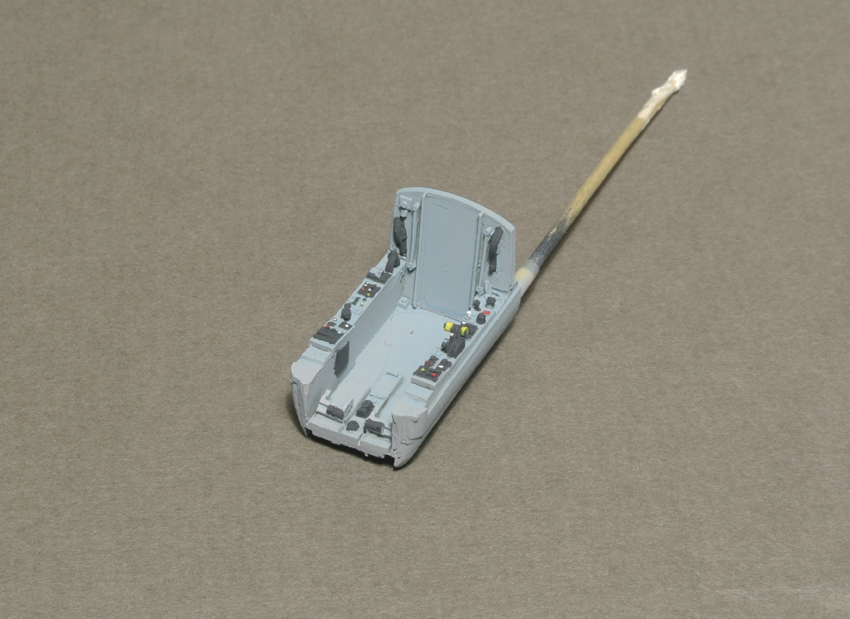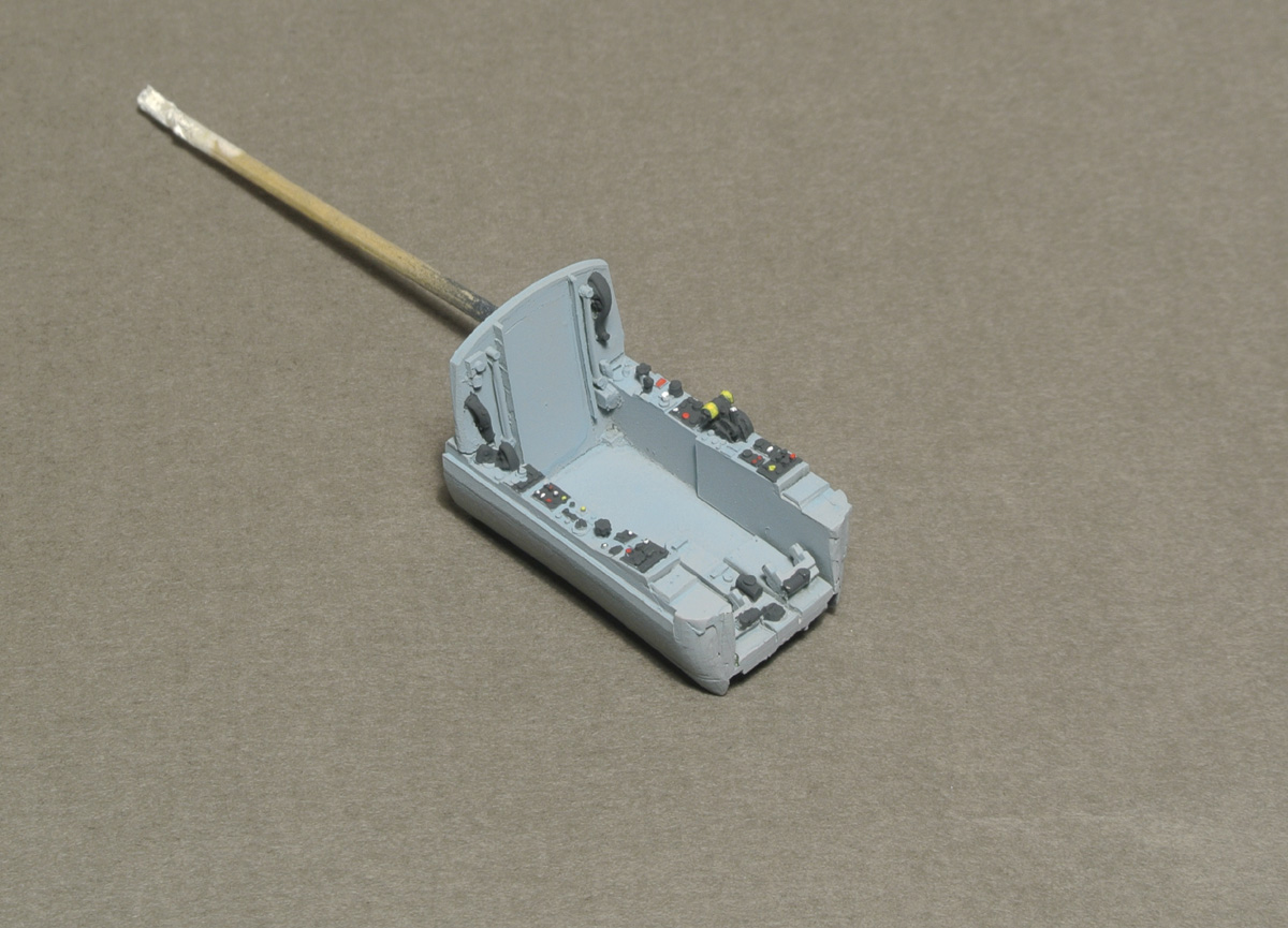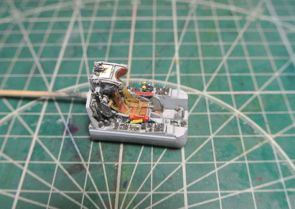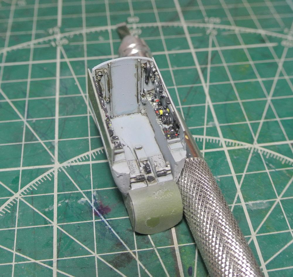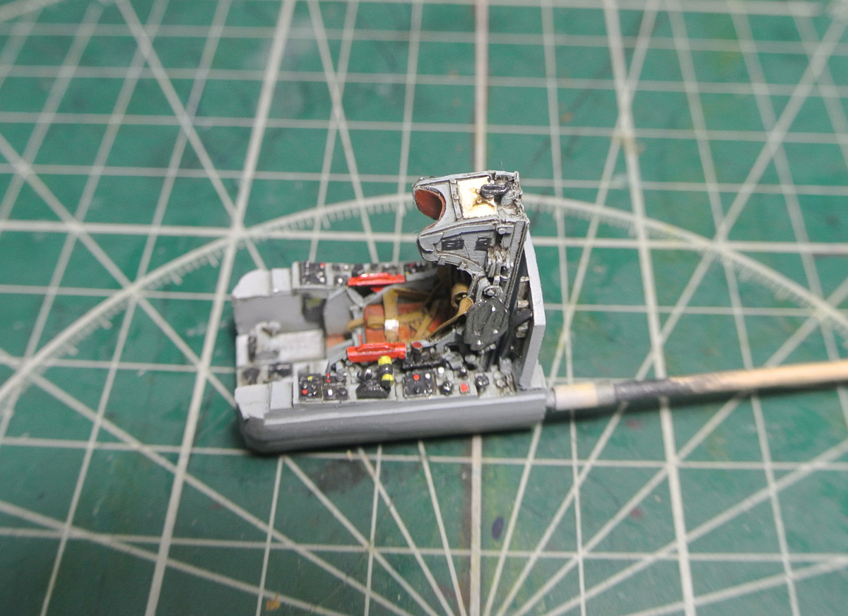 Задул нишу шасси в серый и начал роспись боковой панели кабины. Также расписал ручку управления (не знаю, как она правильно называется).