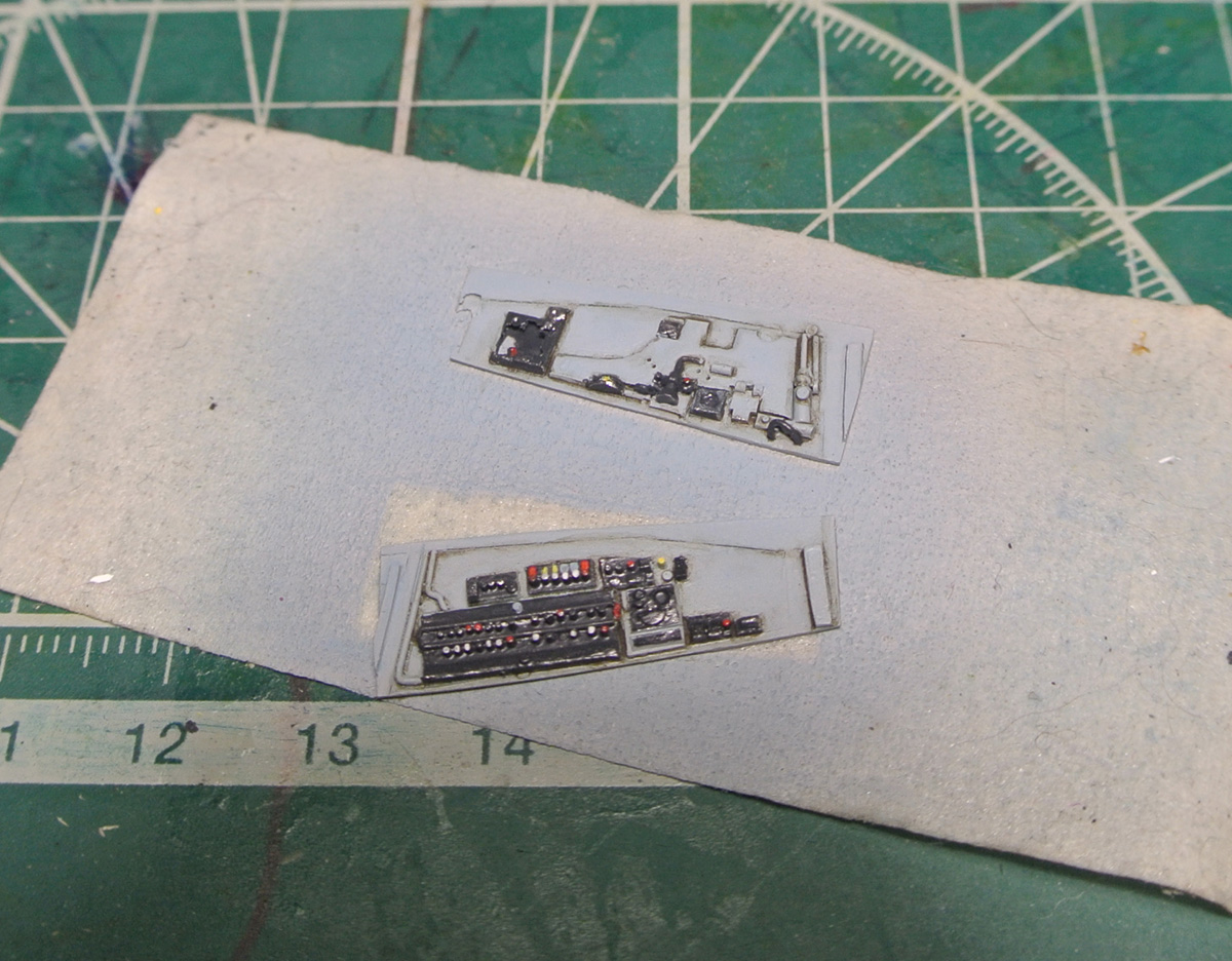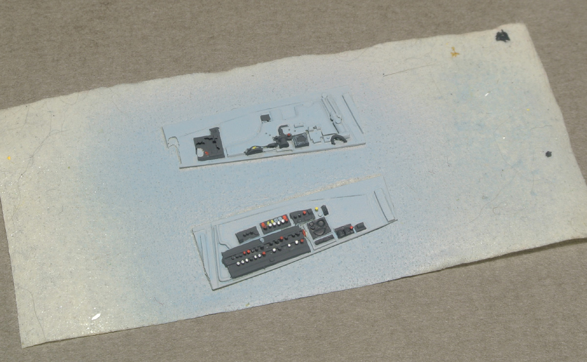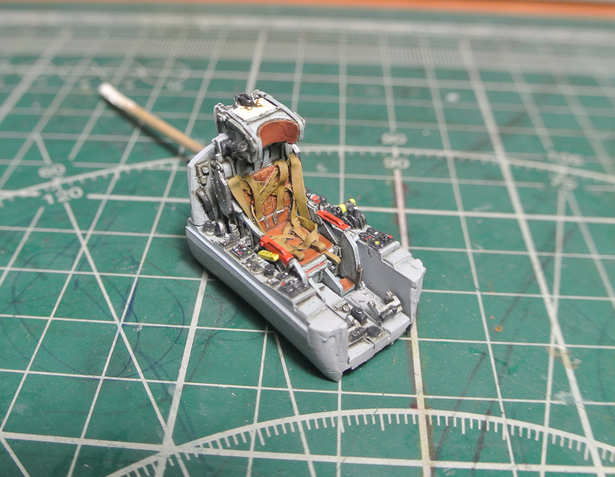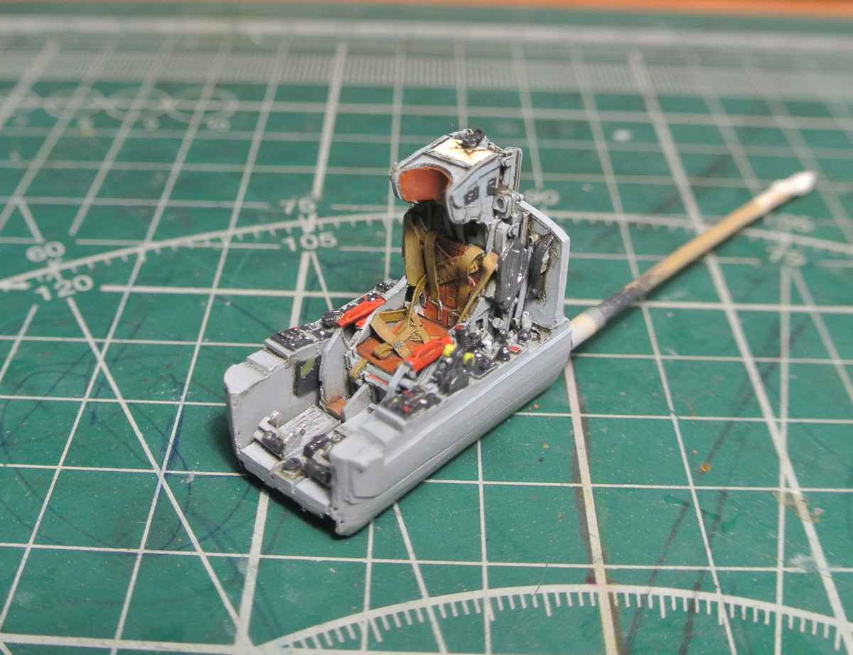 Задул нишу шасси в серый и начал роспись боковой панели кабины. Также расписал ручку управления (не знаю, как она правильно называется).