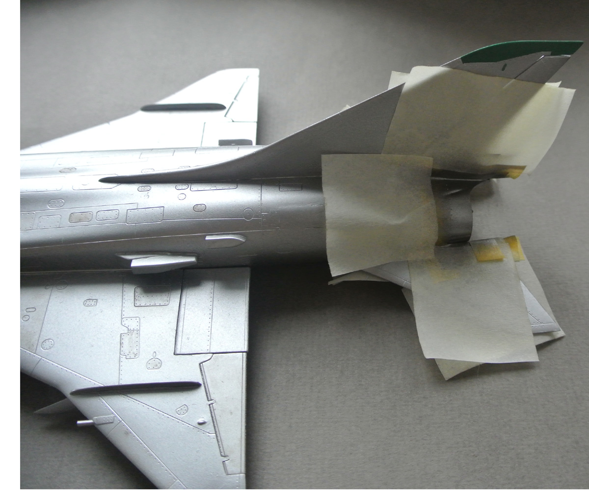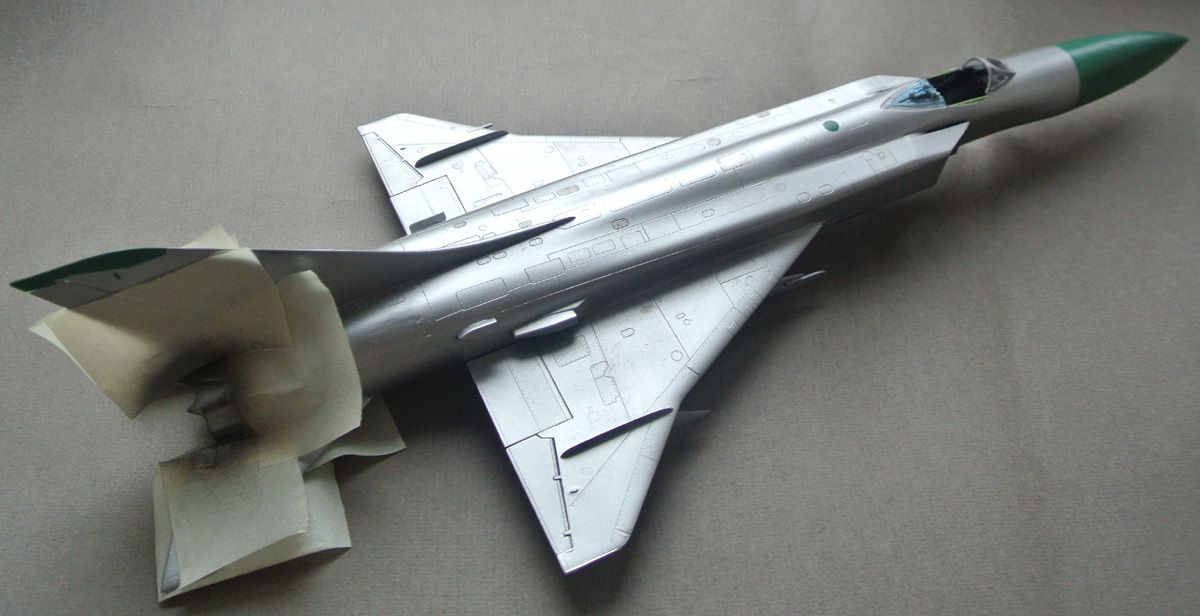 Поднимем немного тему. Нанес базовый цвет, сделал на пробу немного панельного эффекта сверху фюзеляжа и крыльев. Теперь вопрос: виден ли этот эффект? Продолжать или смыть его нафиг? Делал при помощи фильтра для трехтонного камуфляжа (был под рукой, решил поэкспериментировать. После базового цвета прилипло дикое количество пылинок, при попытке их отчистить краска счищается. Оставил в таком виде, не буду их трогать, на след. модели попробую покрывать ее частями, может так меньше будет запыленность.
