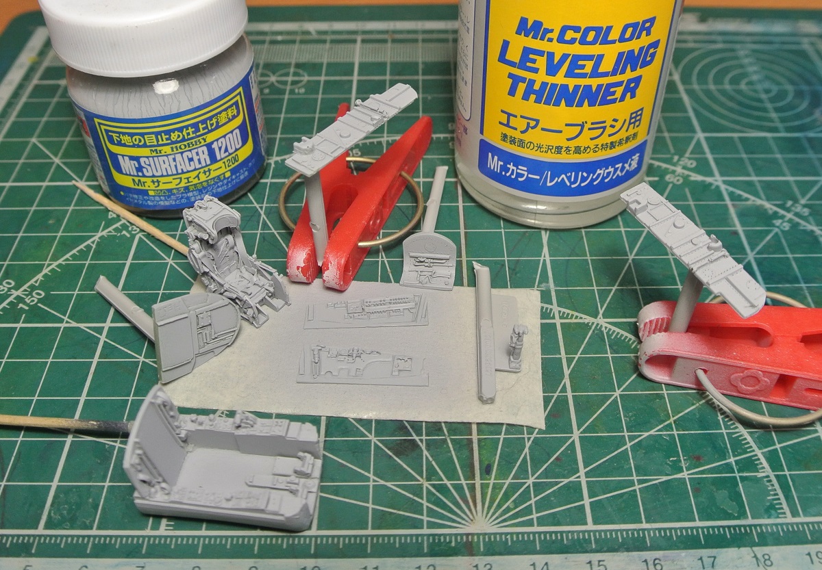 7) Загрунтовал почти все детали и подсборки моей любимой грунтовкой Mr.Surfacer 1200, благо цвет деталей позволяет ею воспользоваться.