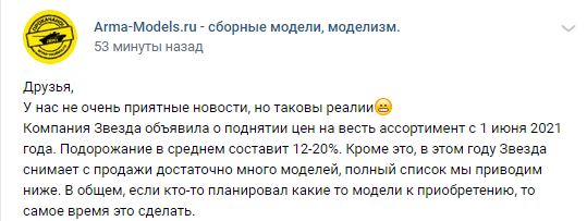 Наступил, так сказать, обещанный День "П" (предсказанное пророками повышение цен на Звезду, якобы опровергнутое позже самой компанией) и что же мы, дорогие товарищи, видим? Цены всё таки выросли, как на Арме, так и на сайте самой Звезды. Пока они остались прежними на Я-Моделисте, но видимо до распродажи ассортимента. Увы, чуда не произошло и даже страшно представить, сколько теперь будут стоить ожидаемые всем модельным сообществом ЭР-1 с фигурками членов Политбюро и подробной клёпкой...