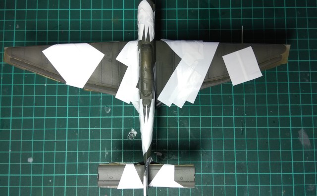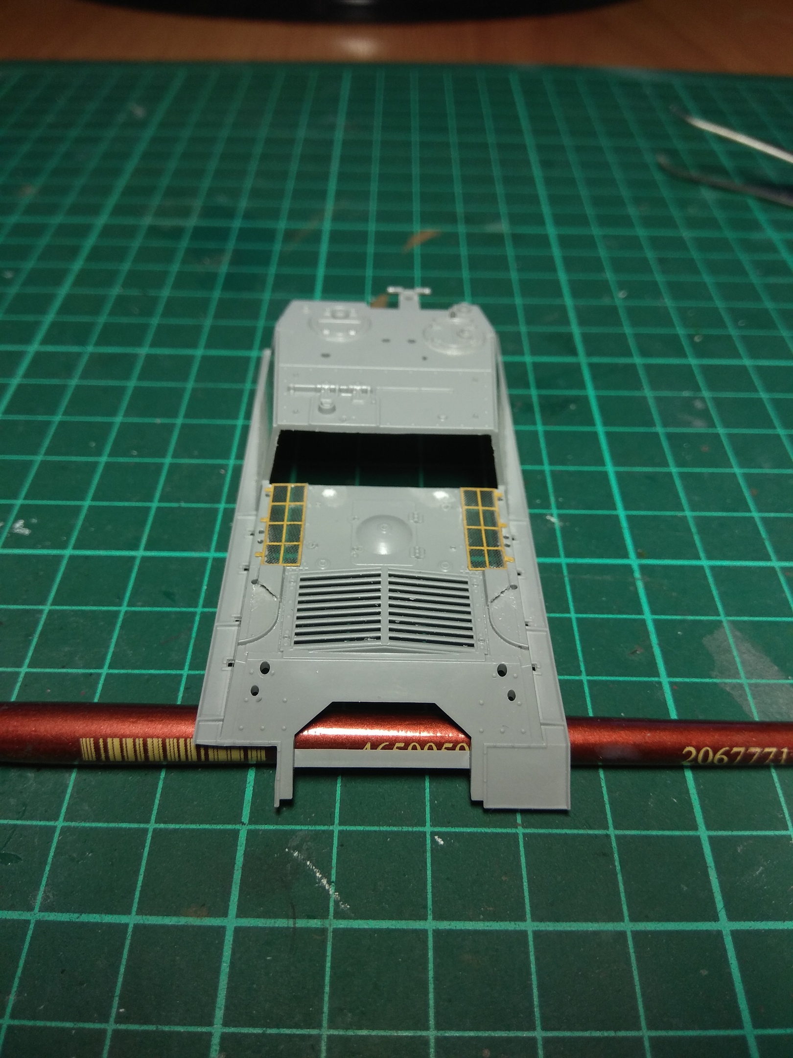По модели. Срезал родные сетки, поставил фототравления и "чайный пакетик". Мне кажется тут я совершил ошибку, и поставил "чайный пакетик" под углом. Замазал утяжки. ПРОКОВЫРЯЛ, получилось именно так, отверстия в патрубках. Сточил немного толщину крылья. Задумал делать "бывалую" самоходку,