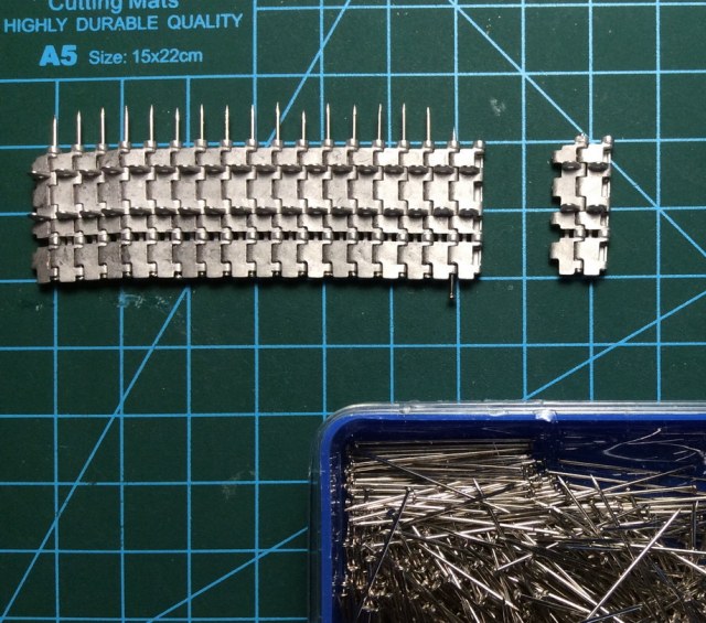 Только при этом хорошо бы рассверливать отверстия в траках чуть меньше, чем нужно - чтобы булавки не свободно болтались, а держались за счёт трения - тогда и не надо будет циаонакрилатом фиксировать.