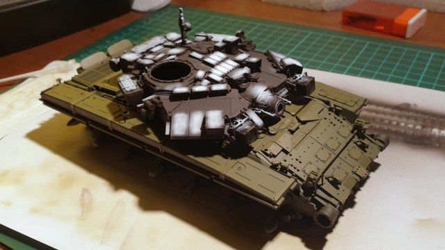 Сейчас в работе Т-90А, пузотанк КВ-2 ждёт покраски и Тигр к корнетом звездовский, который начну скоро собирать.
