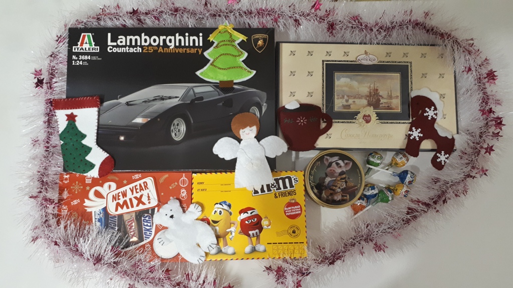 Открыв коробку, просто прифигел (в хорошем смысле слова). Давно поглядывал на представителя семейства Тельцов (а данный автомобиль один из любимых). Про сладости молчу, еле выпросил у детворы на пару минут для фотосессии))) Супруге очень понравились елочные игрушки, сделанные вручную. От детей и жены отдельное спасибо!!!