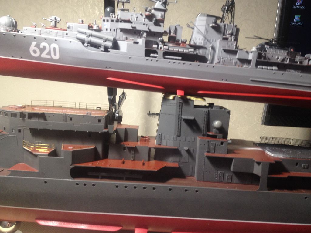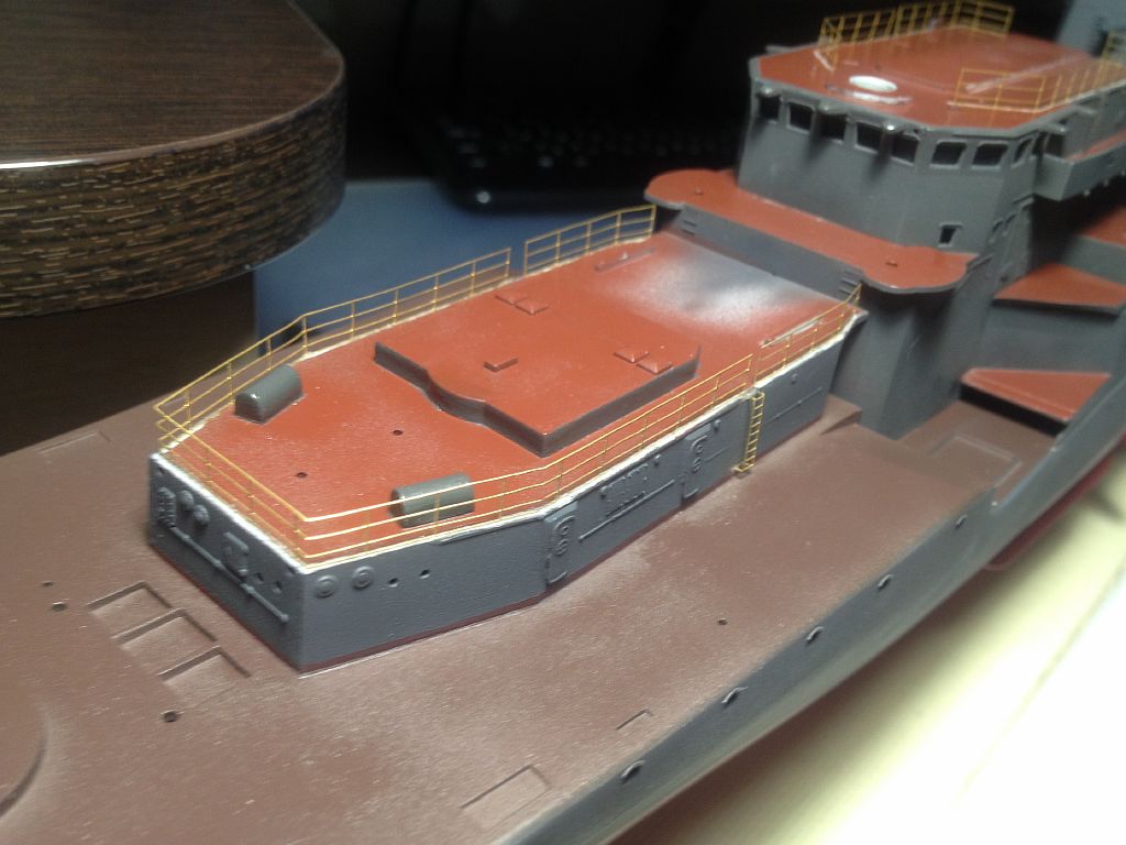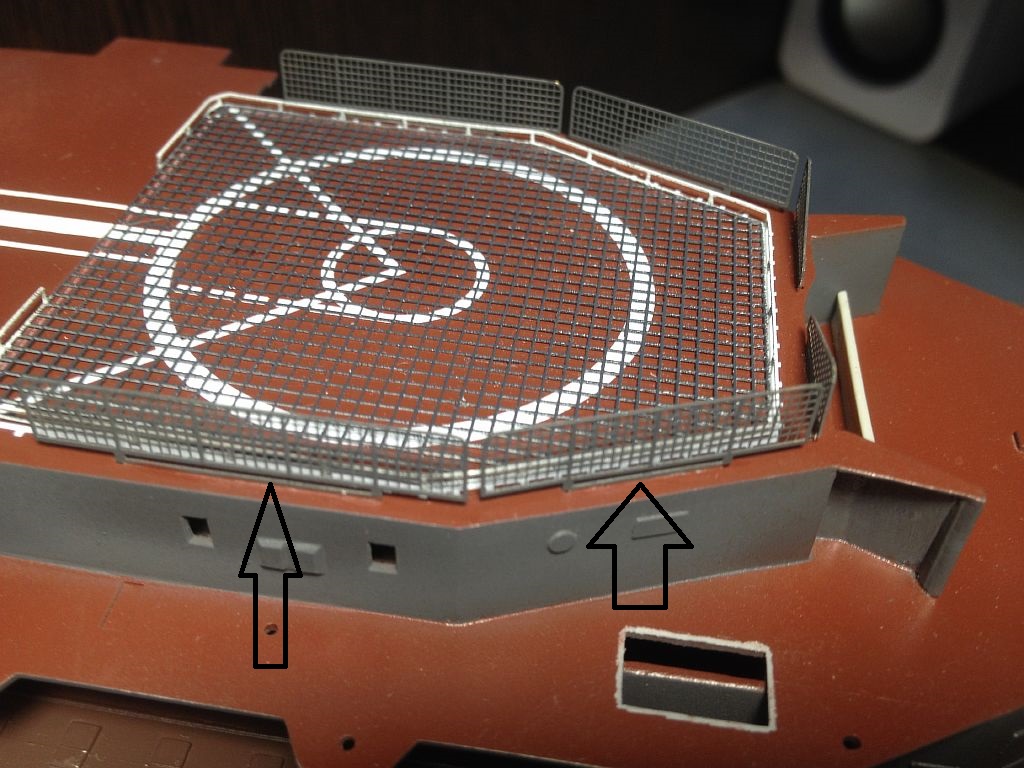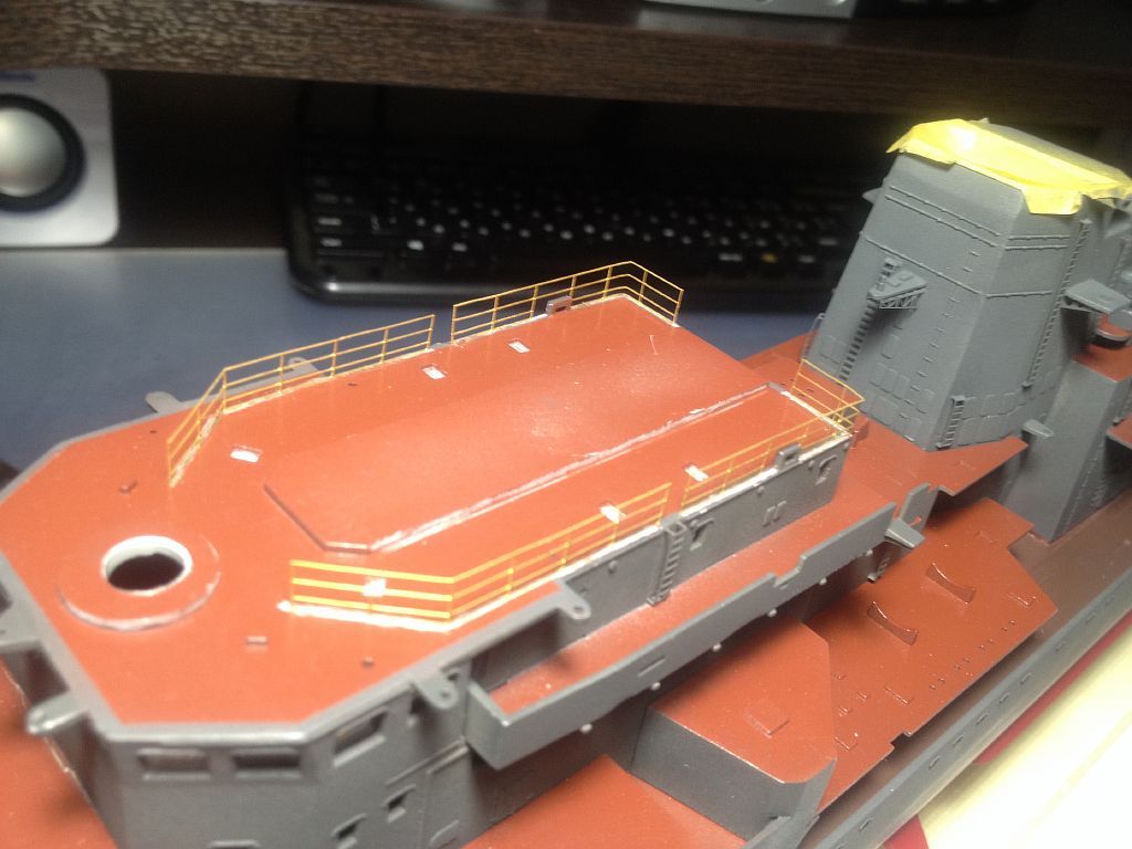 к сожалению объемных фотографий площадки с сетью этих кораблей у меня нет., но есть площадка Орла пр 1135 для КГБ. Там это все хорошо видно и леера с сеткой /на эсминцах принцип тот же/ и саму сеть противоскольжения и можно понять как она крепилась. Вот леер на эсминце Настойчивыйа это Орел....
