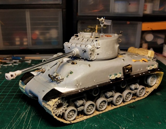Краска XF-64 Olive Drab считается наиболее соответствующей оттенку американской техники Второй мировой. Непосредственно из банки может выглядеть слишком тёмной, и тогда следует добавить XF-60 Dark Yellow. А чтобы не было шагрени, рекомендую добавлять несколько капель глянцевого лака Х-22.