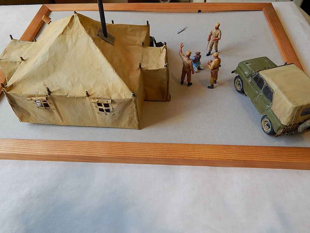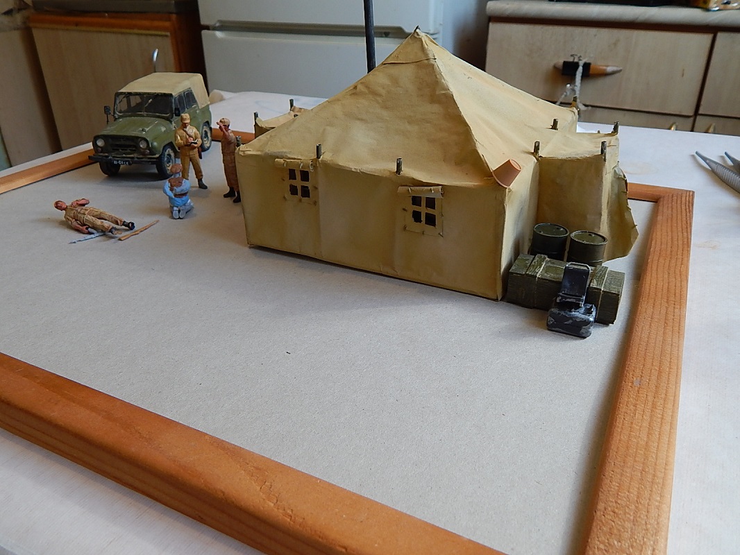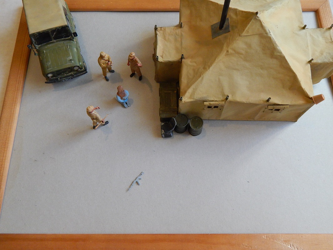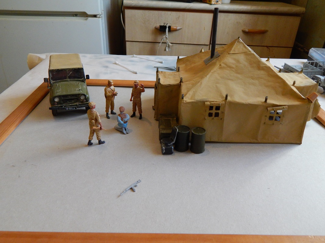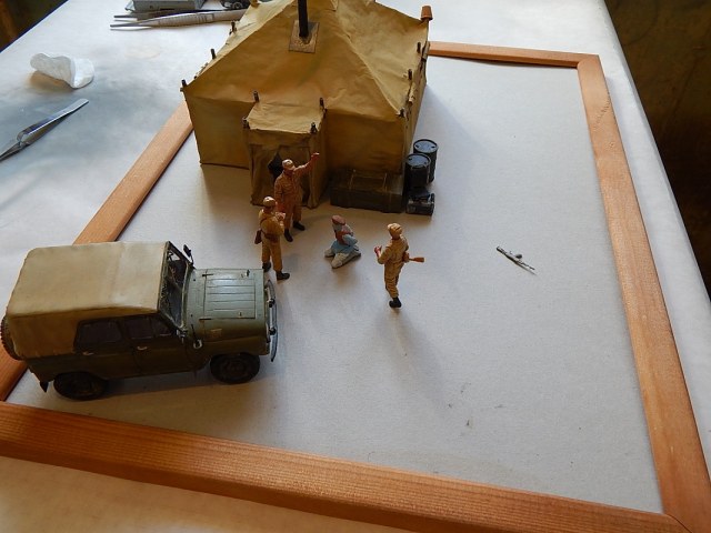 С удовольствием приму "идеи-предложения"по компоновке и сюжету. И вот по поводу бочек и ящика... Думаю из этого замутить курилку под масксетью с "задней" стороны палатки. Может где забор из колючки добавлю...