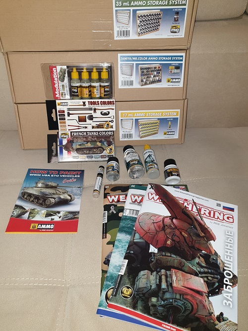 Получил вчера посылку из Испании. Впервые заказывал из-за границы, остался очень доволен как скоростью, так и ценой. С момента заказа до получения в Москве прошло ровно две недели, в текущих условиях считаю это очень быстро. Кроме того, положили в подарок тюбик Oil Brusher и брошюру по окраске, вроде мелочь, а приятно.