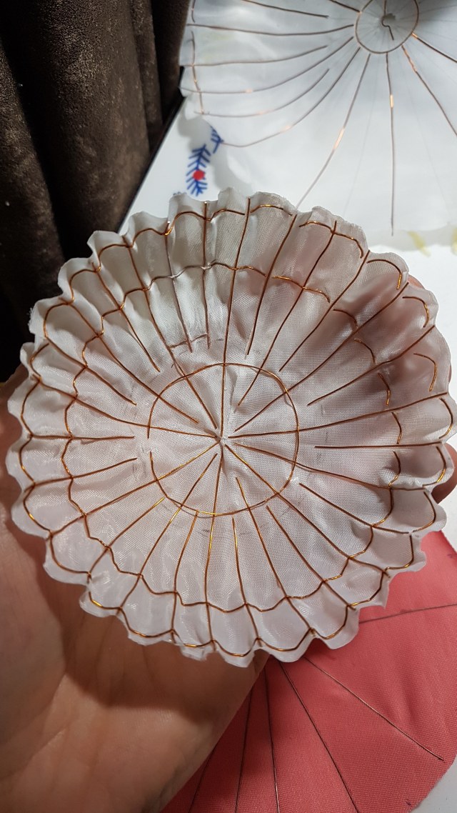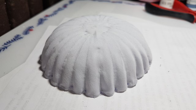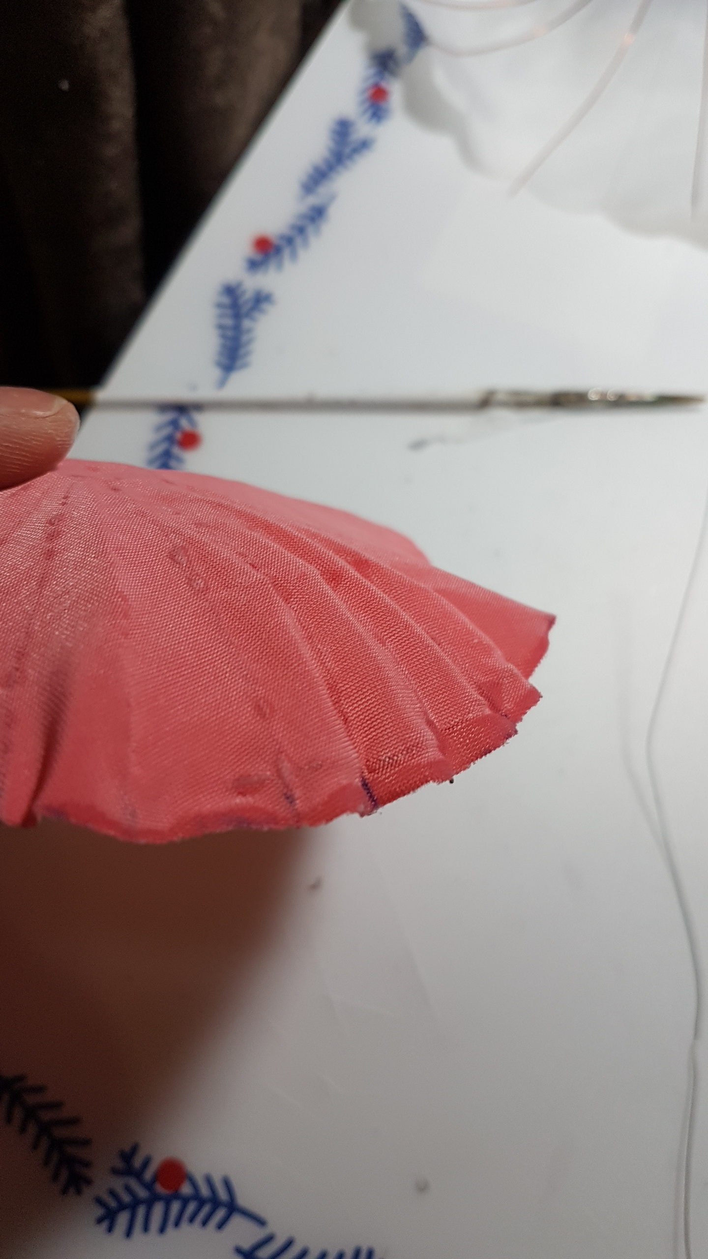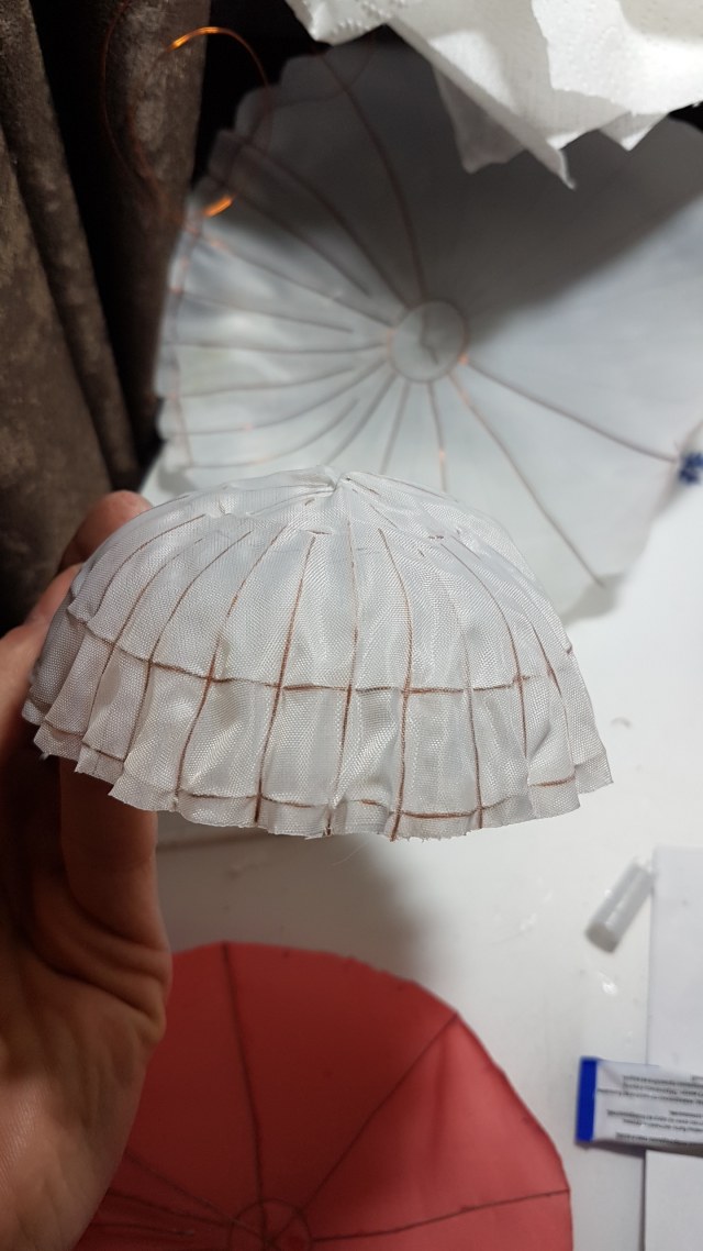 пришлось сделать из пенопласта плотного заготовку, внутреннюю часть 3-4х секций парашюта. Вкладываю внутрь парашюта, прижимаю, обмазываю пва парашют и потом придавливая пинцетом прохожусь феном.