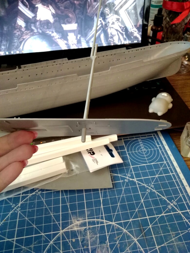 Крузенштерн дождался продолжения работ! Выяснила что мачты клеются только на саму палубу и от лёгкого движения мачт палубу будет просто выгибать. Сопромат не нае......, потому пришлось ввести дополнительные усиления на палубу - квадратные трубки из пластика.