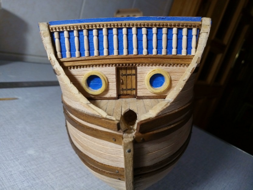На данный момент закончил кормовую галерею. Далее столкнулся с одним неприятным обстоятельством. Начал пилить и примерять рангоут и оказалось что после установки бушприта мой корабль не помещается на полке в шкафу, которую мне "любезно" уступила жена. Каждый вечер таскать его з места на место по квартире не выход, да и опасно. Замораживать стройку тоже не хотелось бы. Думаю, может пока делать такелаж без бушприта, фока-штаг временно притянуть к княвдигеду, чтобы сохранить натяг, а потом, в самый последний момент, в темпе галопа установить бушприт.