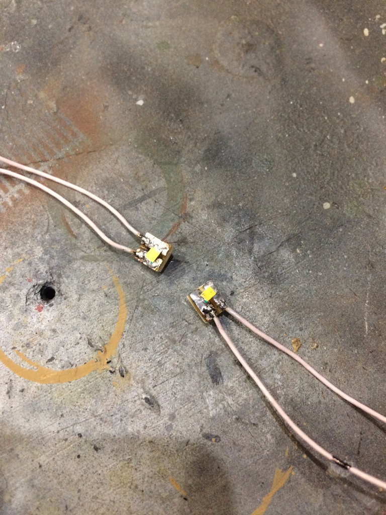 Начал делать светотехнику. Светодиоды smd1206. В цепь красного будет включен резик на 39Ом, чтобы ток понизить до 20мА. Питание - батарейка 3В.